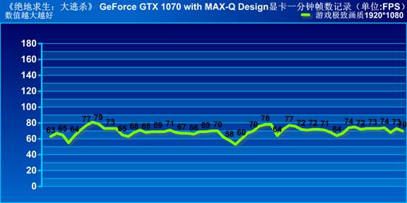 NVIDIA GeForce GTX 1070 with MAX-Q Design显卡运行当前最火热的《绝地求生:大逃杀》,记录一分钟帧数,平均帧数为69帧,显卡可在1920*1080分辨率以极致特效运行该游戏。