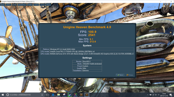 Unigine Heaven Benchmark 4.0平均帧数100帧,成绩2541