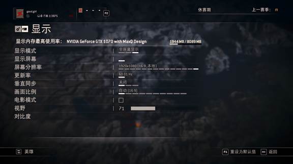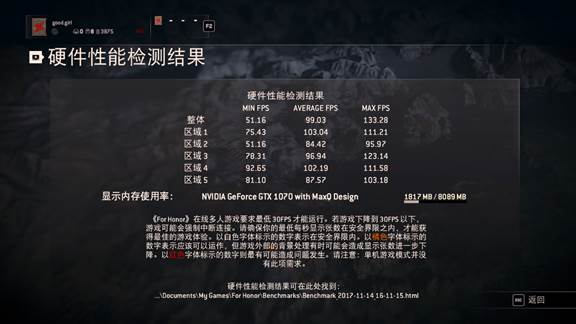 NVIDIA GeForce GTX 1070 with MAX-Q Design显卡以1920*1080分辨率通过《荣耀战魂》自带硬件性能检测结果,平均帧数为99帧,最小帧数为51帧,可流畅运行该游戏。