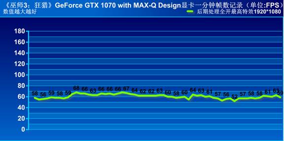 NVIDIA GeForce GTX 1070 with MAX-Q Design显卡运行《巫师3:狂猎》,记录一分钟帧数,平均帧数为60帧,显卡可在1920*1080分辨率以超高图像质量运行该游戏。