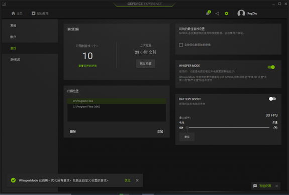 这样强大的性能,玩游戏时,笔记本散热器会不会发出很大的噪音,发热量会不会很大?你大可放心,NVIDIA MAX-Q设计方案为你解忧,玩家只需开启NVIDIA GeForce Experience(以下简称“GFE”)软件中的WhisperMode功能即可让接通电源的笔记本以流畅帧数运行游戏的同时,让笔记本变得更安静。