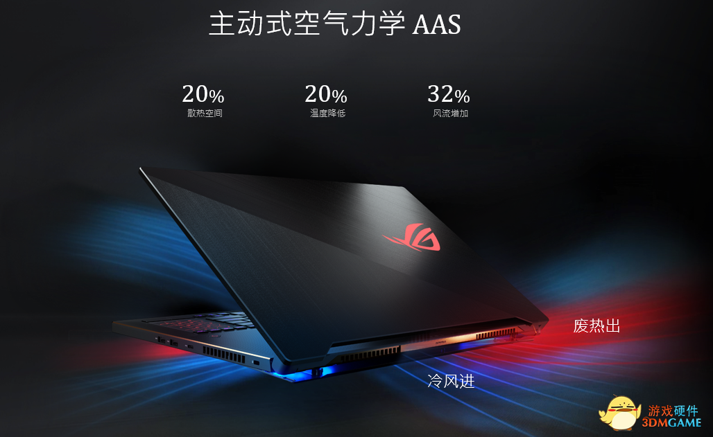 而冰刃3s Plus还搭载GeForce RTX 2080搭载Max-Q设计显卡,散热无疑是最大挑战。为了避免影响性能,ROG设计了一个全新的散热系统——冰川散热架构,当打开外盖时,ROG冰刃3s Plus能让底部自动敞开,增加内部的散热气流流通。