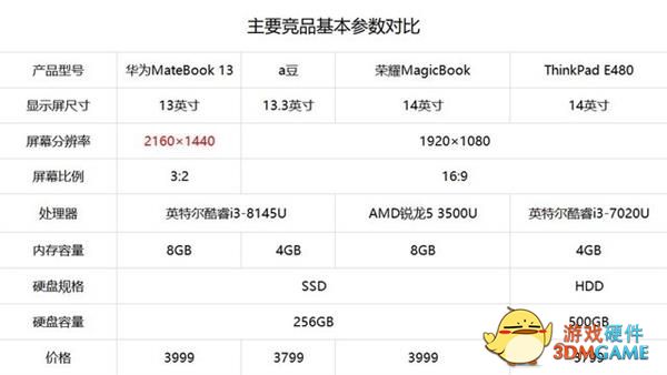 其实从对比中很明显的能够看出一个特点,英特尔酷睿i3版MateBook 13是4000元以内价位段,唯一一款拥有2K分辨率,且屏幕比例更契合办公体验的3:2比例显示屏笔记本电脑。