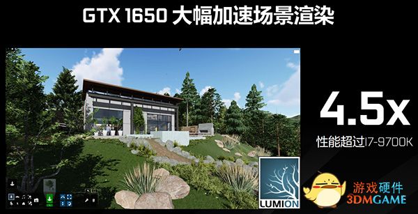 以实时3D可视化工具Lumion 8制作电影和静帧作品为例,创作者以GeForce GTX 1650笔记本配合最新版Creator Ready驱动一起使用,笔记本对大幅加速场景进行渲染时,其性能是i7-9700K的4.5倍,可为创作者节省更多工时。