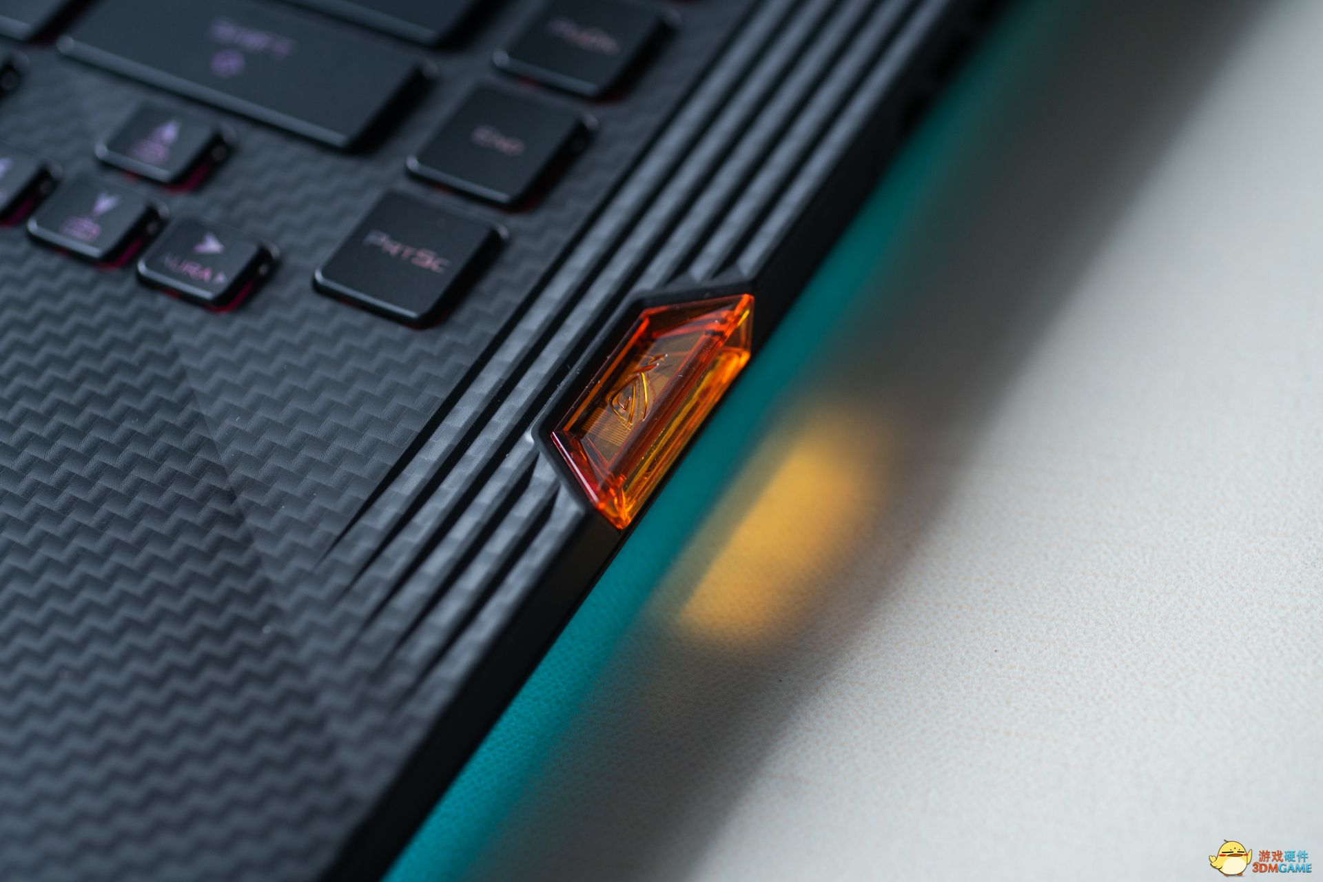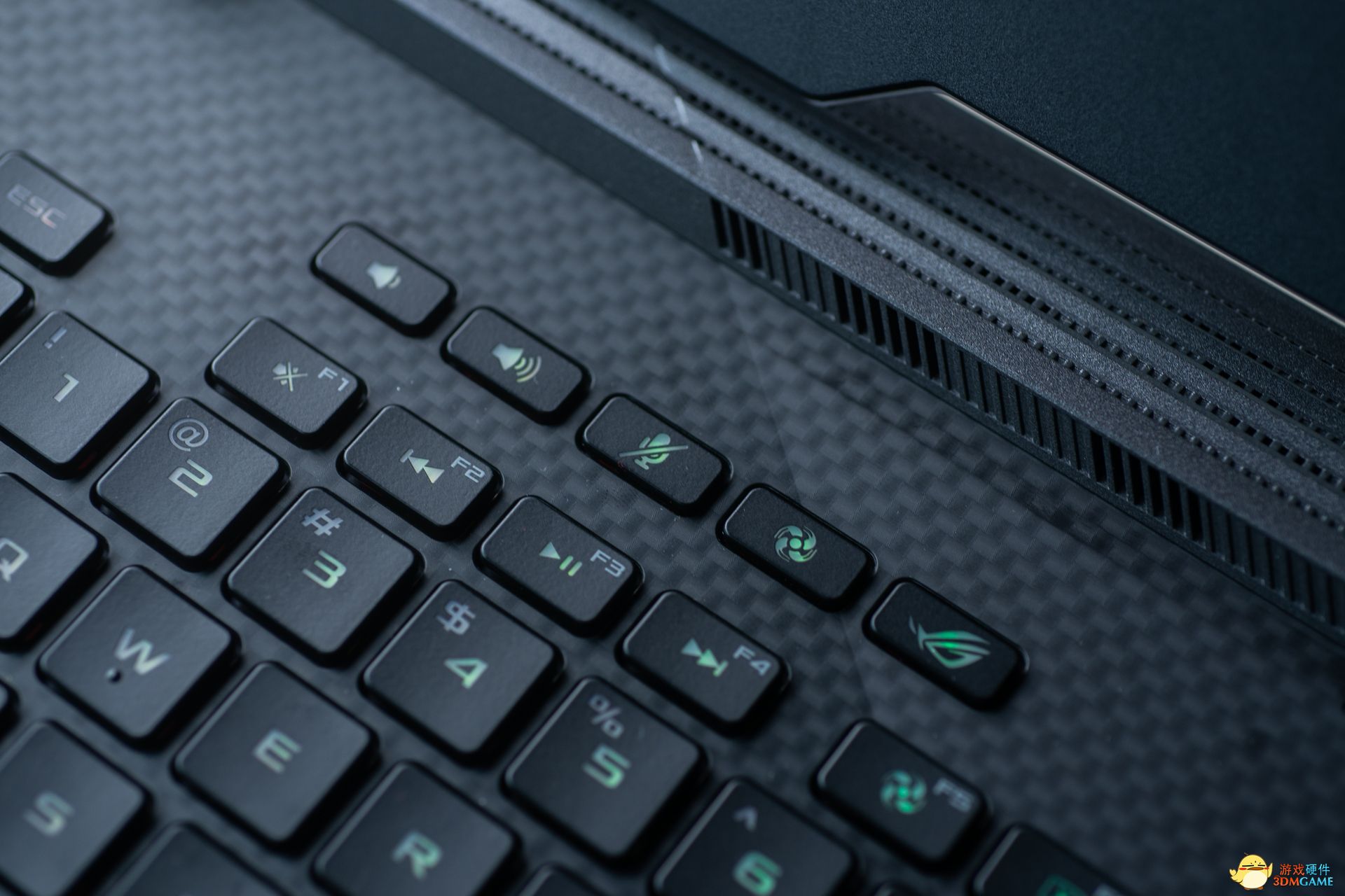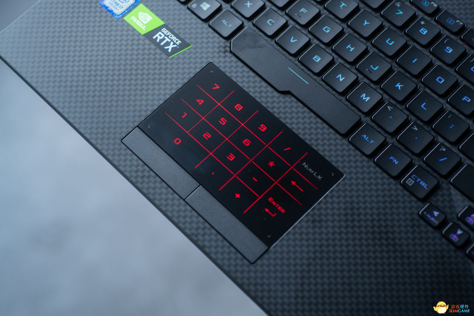 键盘部分采用了基本居中的设计,键盘区域上方有音量控制键和风扇以及内置ARMOURY CRATE控制中心的快捷键。这几个功能键在按键手感也做了区分,比主键盘区的手感更硬一些。这块拥有单键RGB背光的键盘的手感中规中矩,键程比较充足,回弹偏柔和。小键盘区域被做到了触摸板上,通过长按触摸板右上角,就可以让它变身成一个红色背光的数字小键盘。取消数字小键盘的设计,让键盘区域看起来更加协调,对游戏玩家来说常用按键的位置也更加合理。