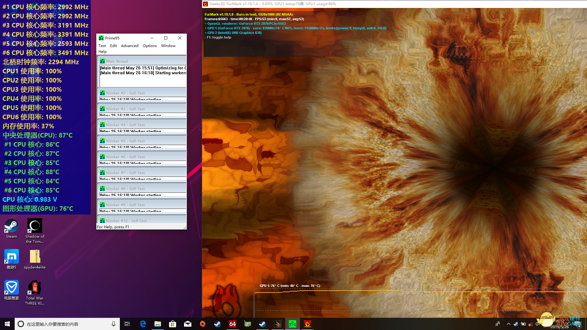 在CPU+显卡的双烤测试中,CPU温度在90℃以下,显卡可以稳定在76℃,这个散热能力横向来看算是比较不错的水准。