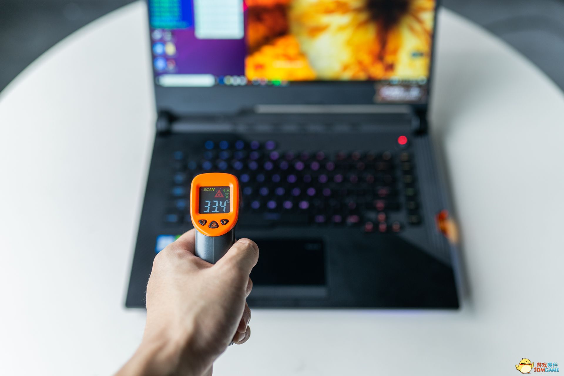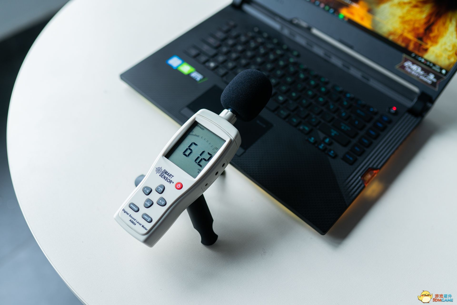在拷机时我们选用的是Turbo模式,风扇几乎在满载运行。室内30分贝左右背景噪音的前提下,风扇运行时测试噪音有60分贝左右,这个动静已经算是比较大了,玩家还是需要搭配耳机来进行游戏。不过键盘表面温度控制得十分不错,实测WASD区域只有33℃上下,只有微微热的感觉。