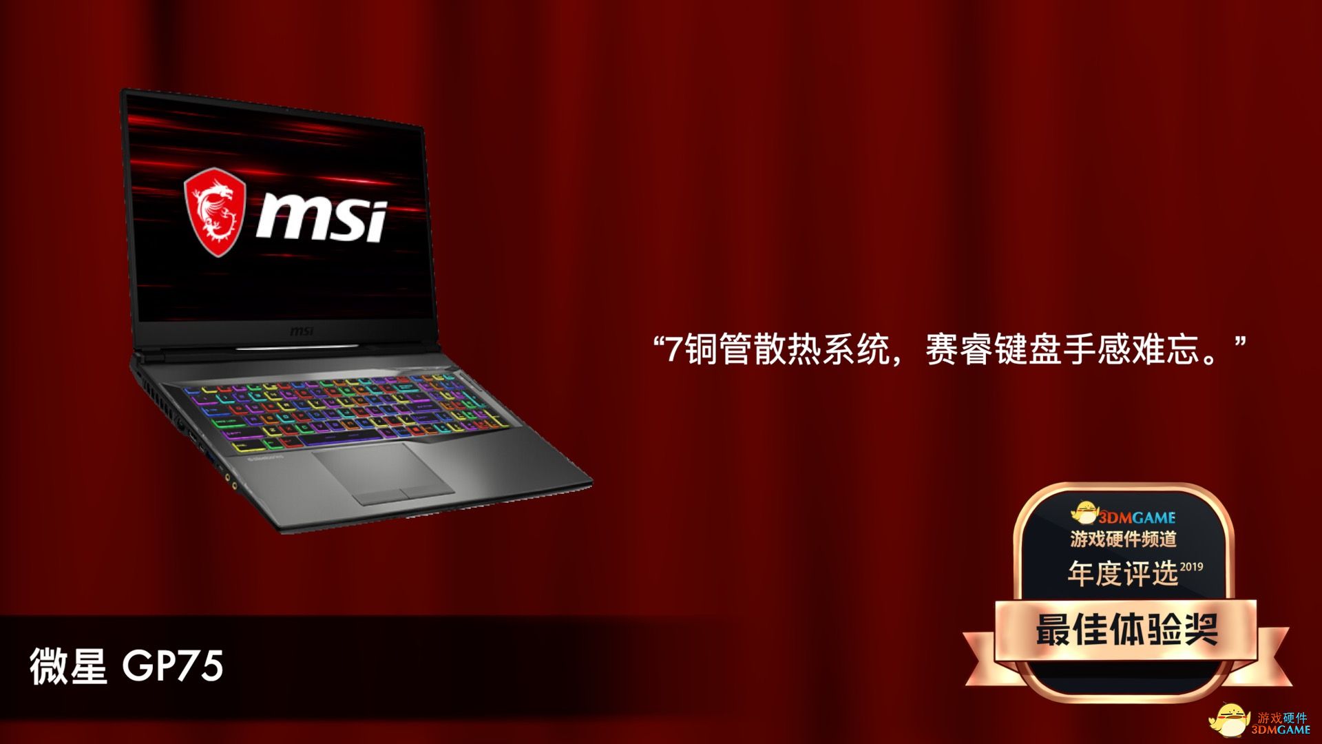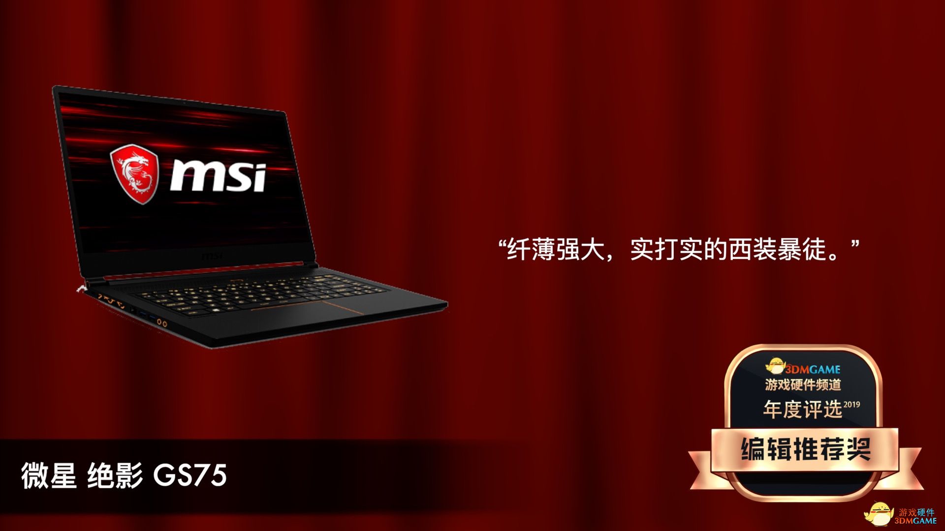 编辑推荐奖我们选择了微星的绝影GS75。简洁的设计,黑金的配色,在颜值上就给人留下了很好的第一印象。在18.9mm厚的机身里塞下了标压处理器和RTX显卡,有着轻薄本的样子,游戏本的心,是一款实打实的西装暴徒。