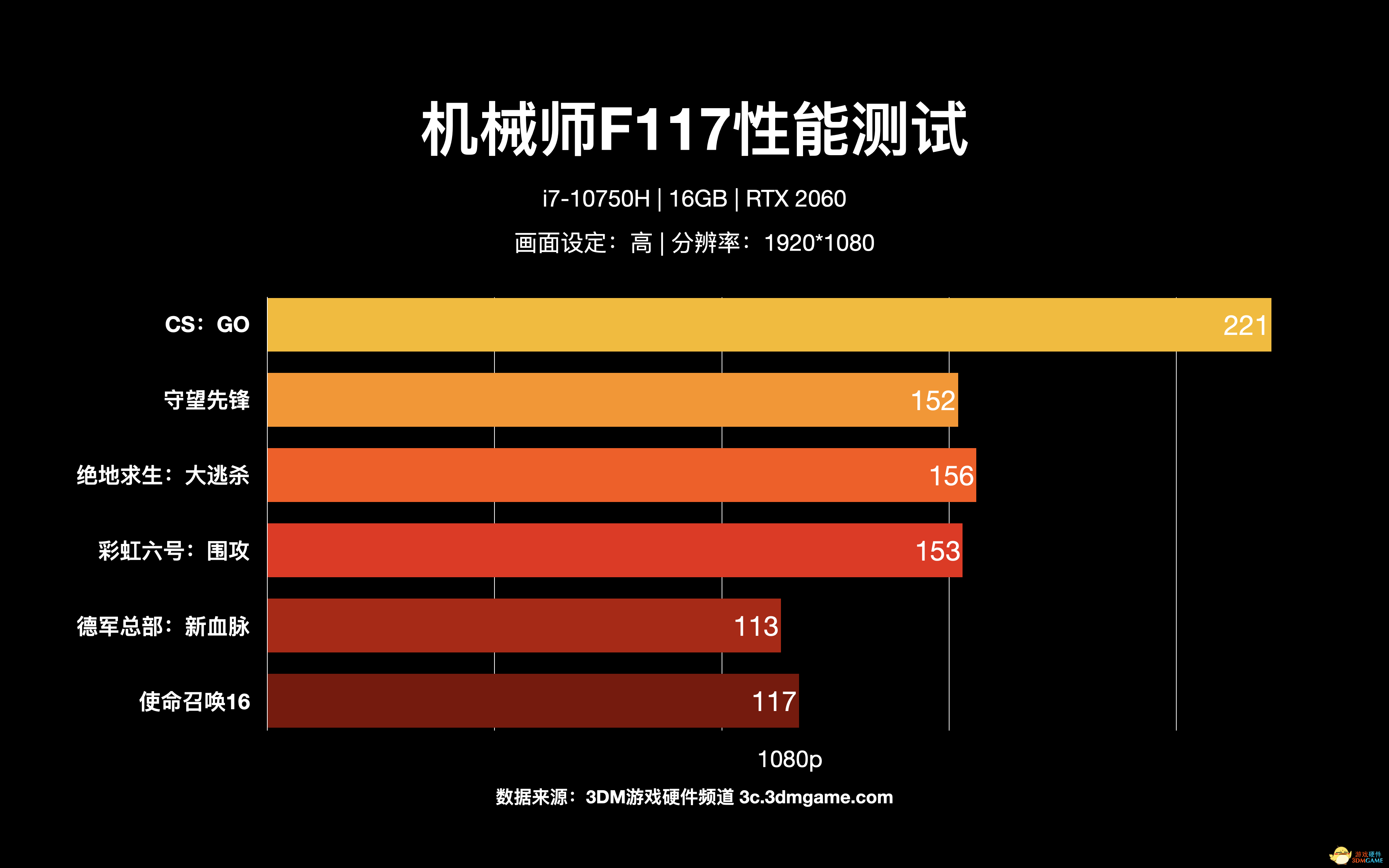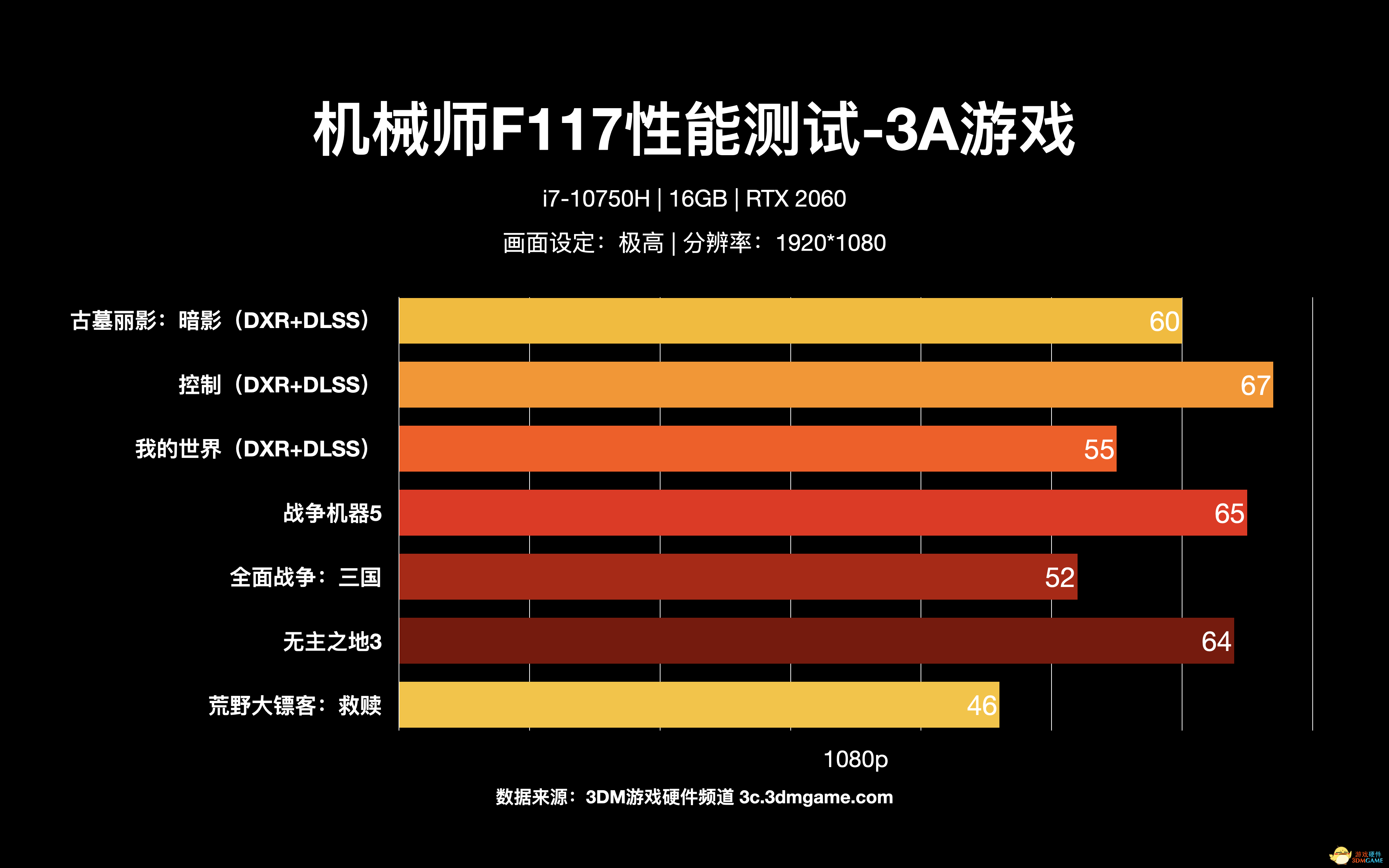 从成绩上看,搭载了GeForce RTX 2060的这款机械师F117在1080p全最高档设定下,所有参与测试的热门3A大作都能保证以60帧左右的性能流畅游玩;