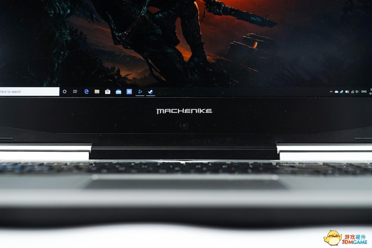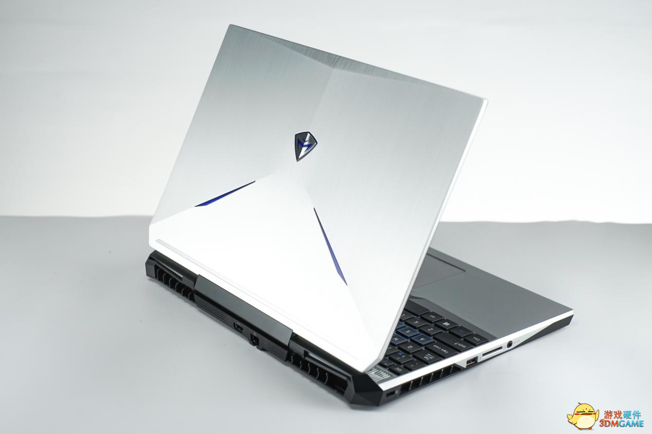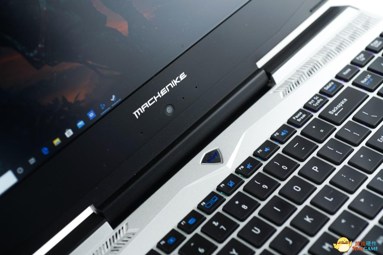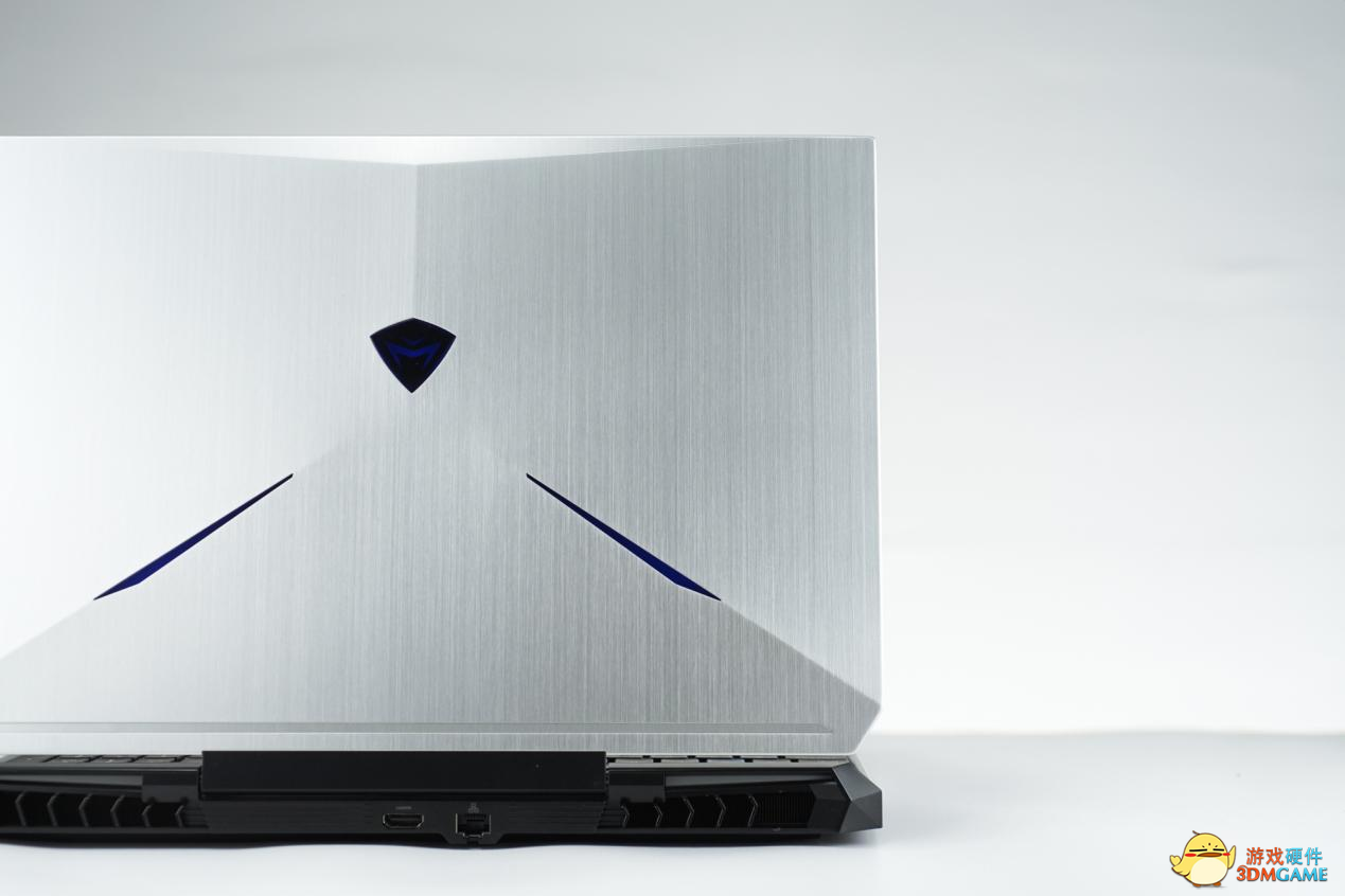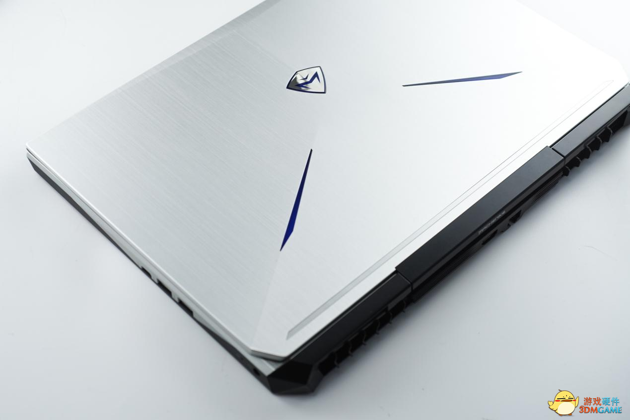 机械师F117在外观部分采用了棱角分明的设计,正如我们经典的F117隐形战斗机那样,A面有多条硬朗的线条点缀,表面为金属材质,采用了拉丝工艺处理。笔记本打开状态下LOGO和两侧的装饰条都会亮起提神的蓝色背光。