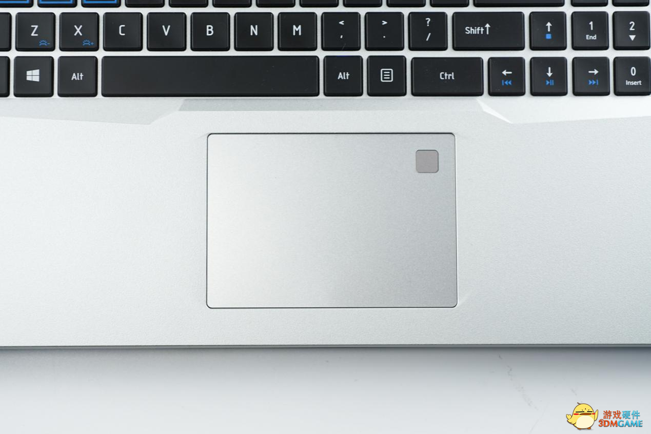触摸板部分采用了玻璃材质,支持Win10的精准触摸驱动,并且在右上角区域还设计了一个支持Windows Hello生物识别的指纹识别模块。