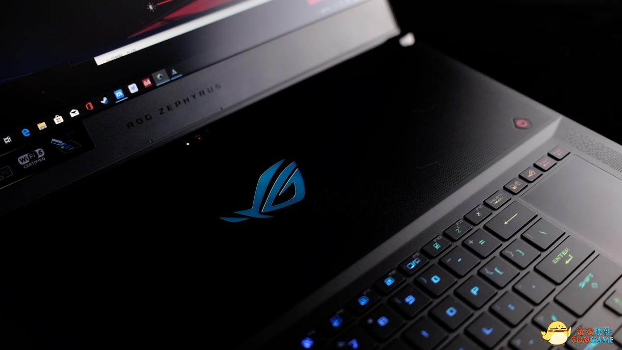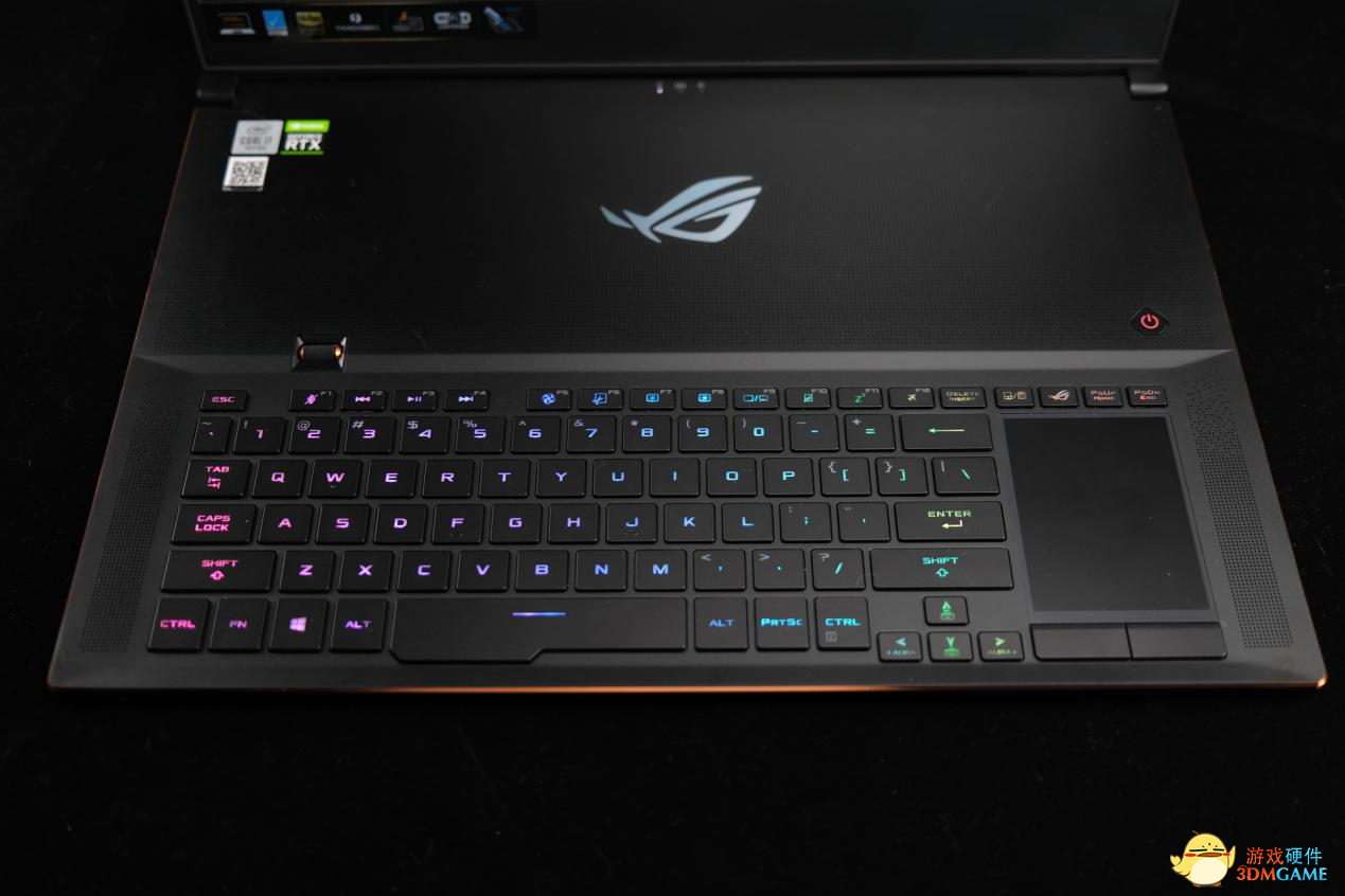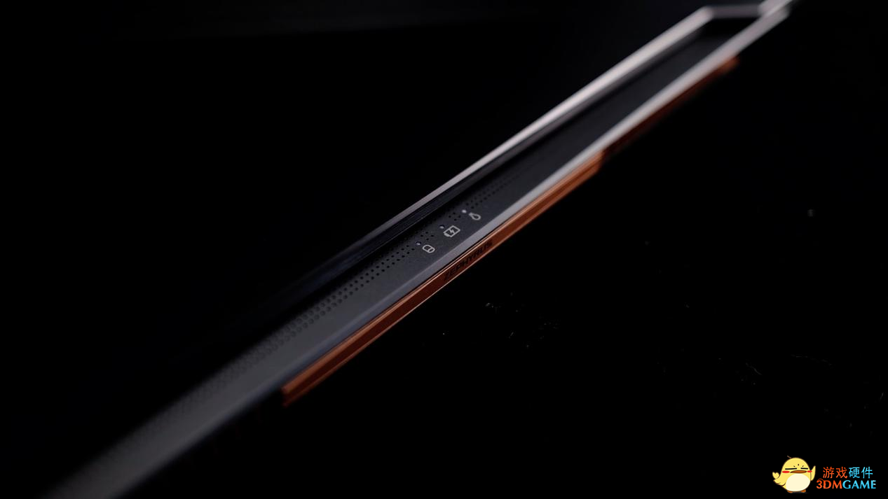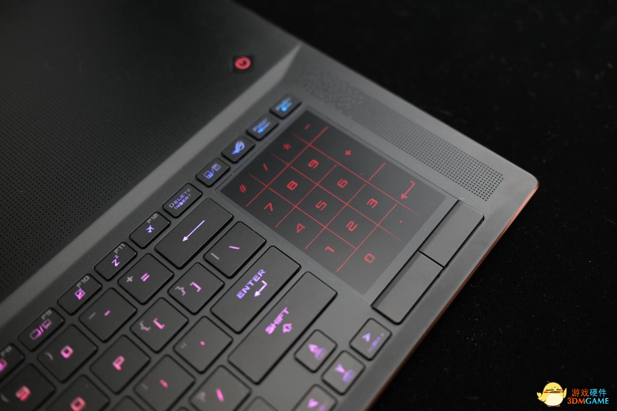 C面边缘切出了一道提神的金色倒角,整个键盘区域下移,躲开了主板上的两个发热大户,右侧触摸板可以一键变身成数字小键盘。在键盘区域上方还贴心的又安装了一个RGB LOGO,避免了败家之眼只有别人看得到的尴尬。