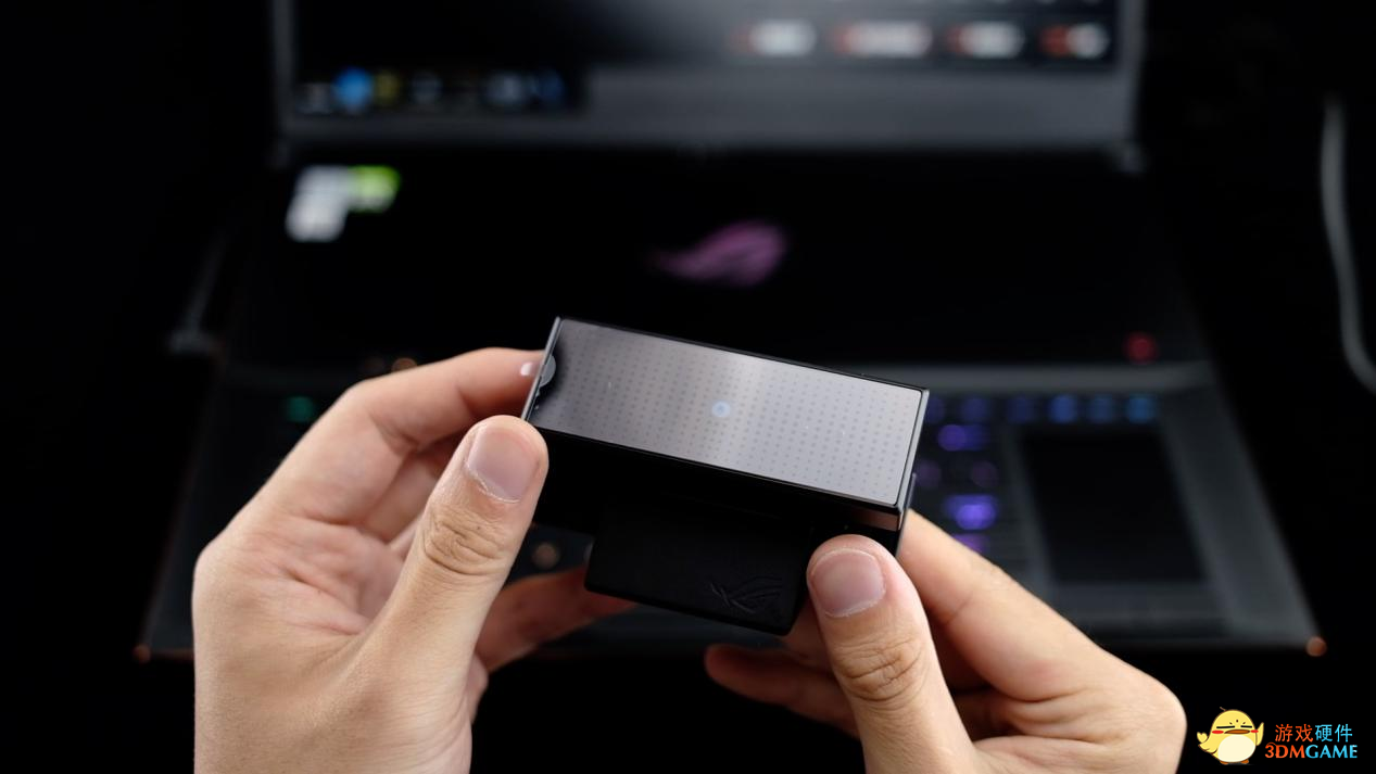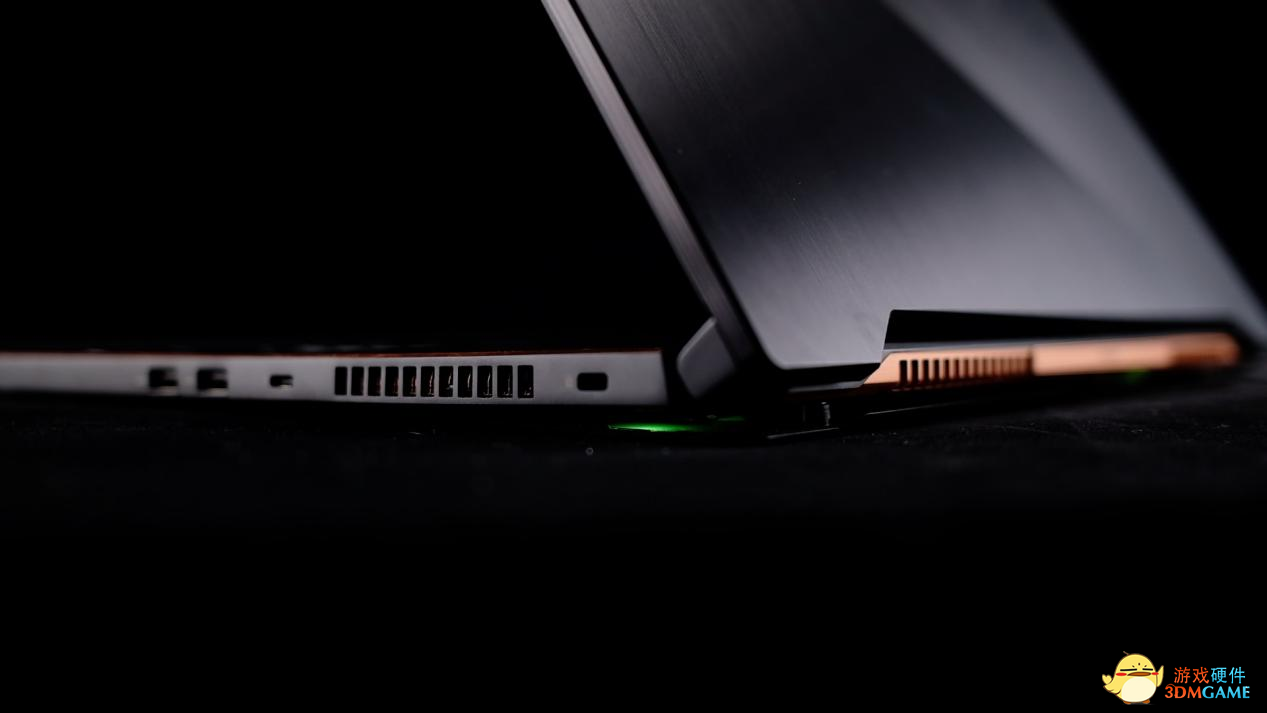 笔记本可以单手打开,打开之后屁股会抬高从而提供更大的散热进风口,在缝隙里也没忘了安装RGB装饰灯。
