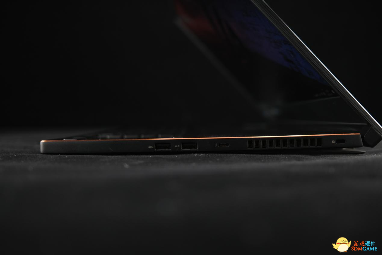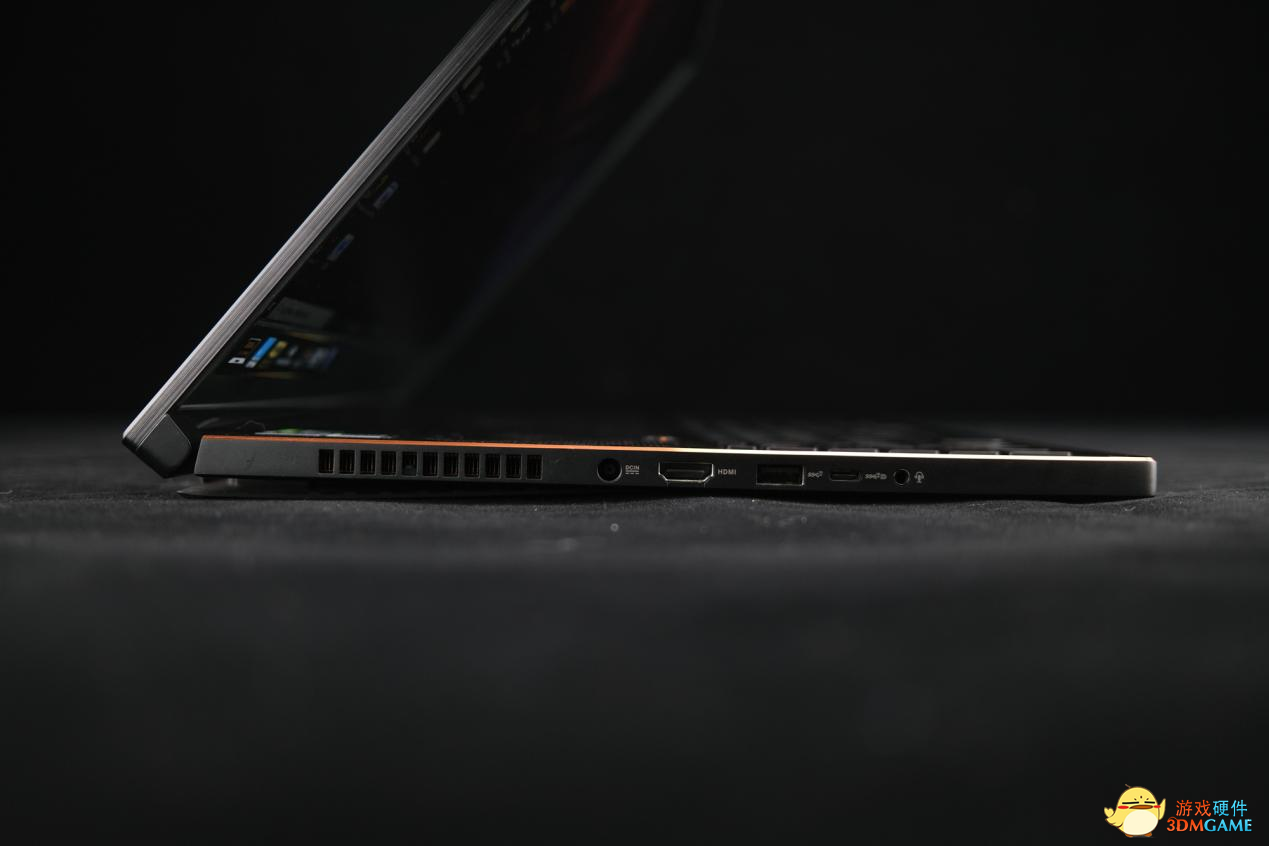接口部分,左边依次是电源、HDMI 2.0b、Type-A USB 3.2 Gen2、支持DP1.4输出的Type-C USB 3.2 Gen2和音频接口;右侧有两个Type-A USB 3.2 Gen1,雷电3也终于得以补全。