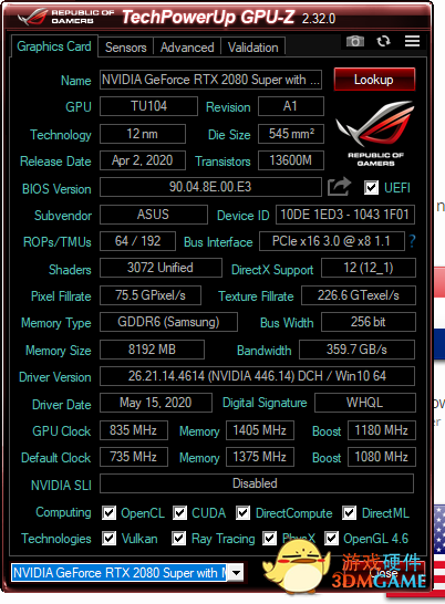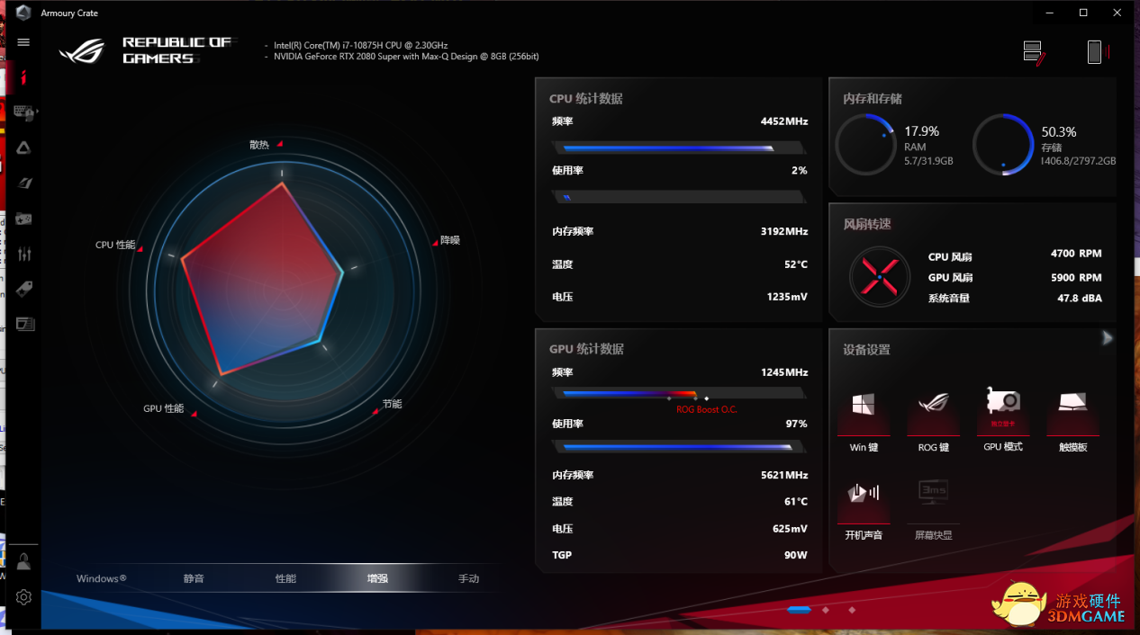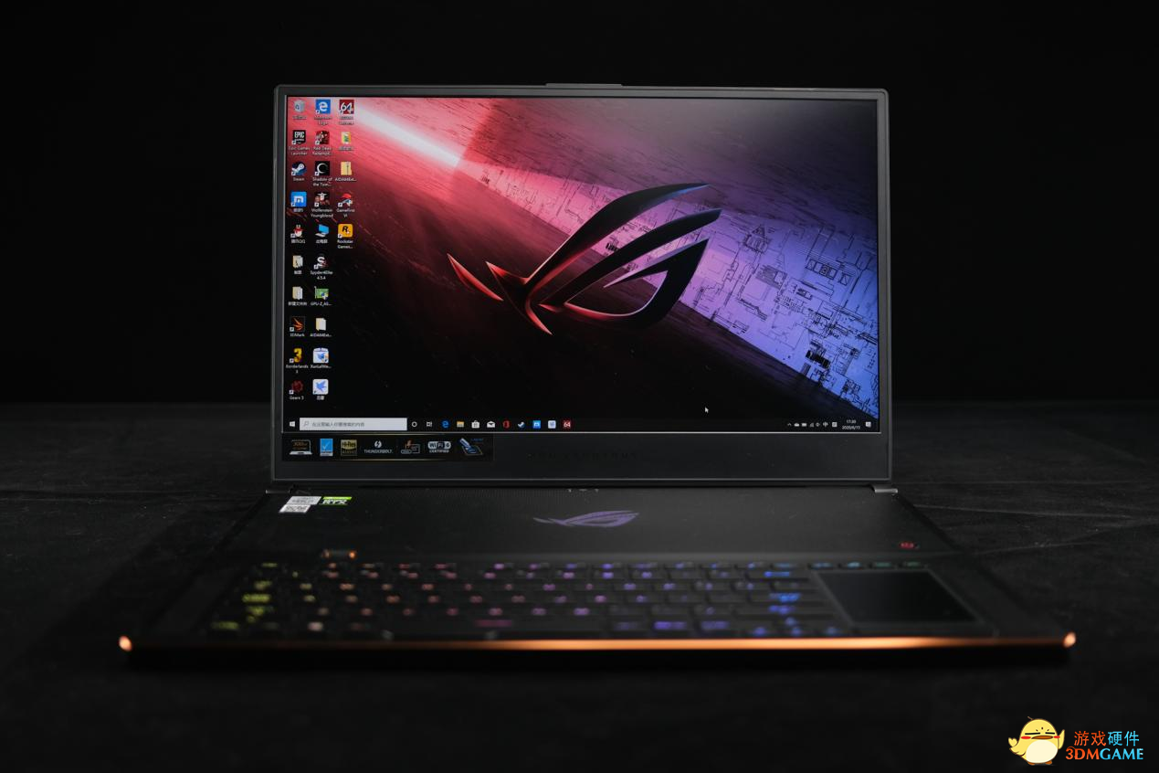 显卡部分,冰刃4 Plus提供了RTX 2070 SUPER以及RTX 2080 SUPER Max-Q两个版本可选,我们今天拿到的是RTX 2080 SUPER Max-Q的版本。这块显卡默认状态下基础频率735MHz、加速频率1080MHz,对应的是80W功耗;但在奥创智控中心当中开启增强模式之后,显卡的频率借助ROG BOOST功能,可以在最高1330MHz的频率下运行,综合工况这块Max-Q显卡是可以保持在90W左右的功耗下运行的。而且还可以借助NVIDIA动态加速功能,在CPU负载较低的时候,提升至105W功耗。