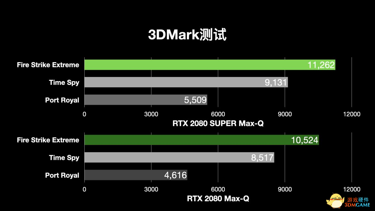 3DMark测试我们来对比上一代的RTX 2080 Max-Q,基准测试项目性能提升幅度在7%左右,光追踪部分测试成绩提升幅度则更高一些。