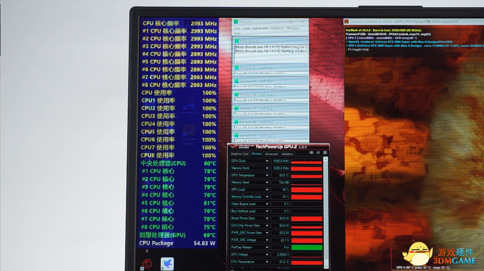 Prime 95在加上甜甜圈进行双烤测试的话,20分钟后CPU温度稳定在80℃以下,全核心频率维持在2.9GHz,功耗为55W左右;GPU部分温度是70℃,频率基本在1100MHz左右,功耗可以维持在90W左右。可以看出冰刃4 Plus的系统调度非常保守,特别是CPU部分,拷机后半段的频率的确有些偏低了。