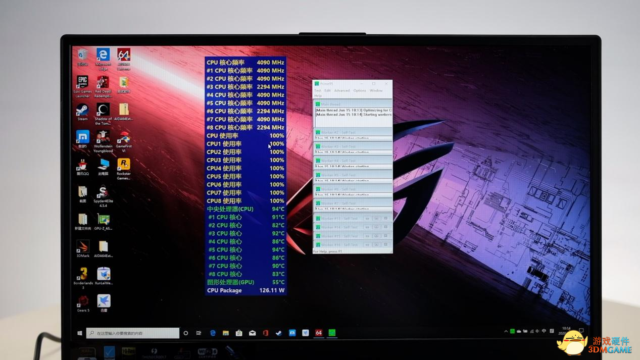 实际使用Prime 95进行单拷CPU的测试CPU温度最高来到94℃,频率保持在4GHz左右,个别核心频率稍低,此时CPU功耗可以来到125W左右。