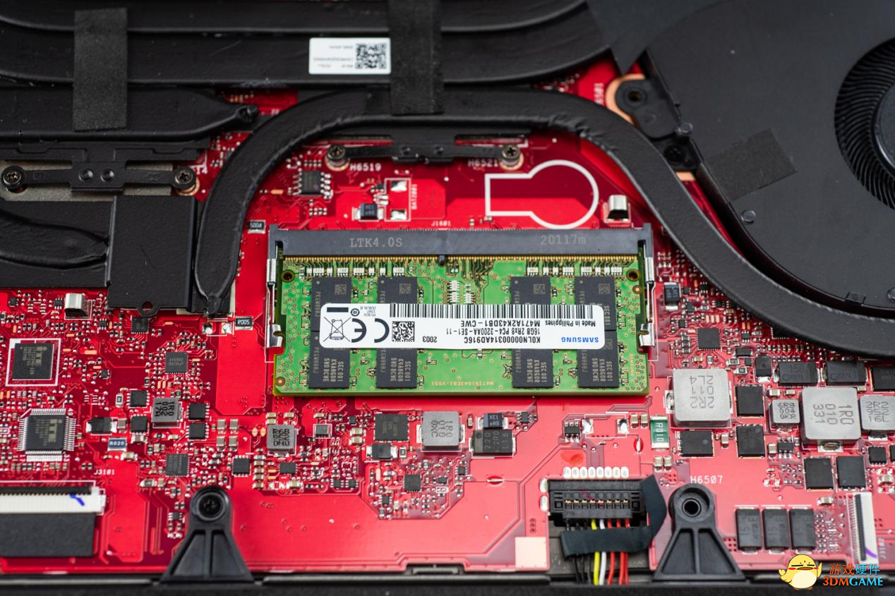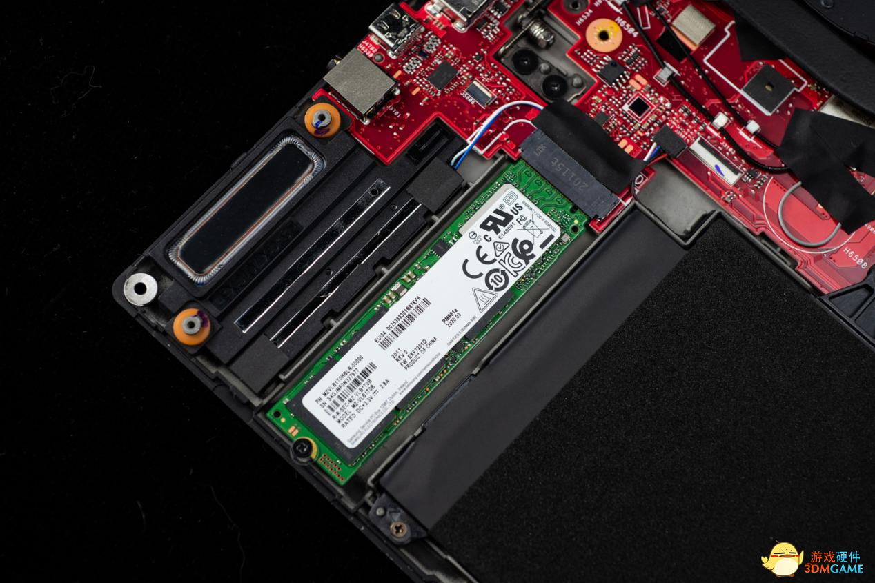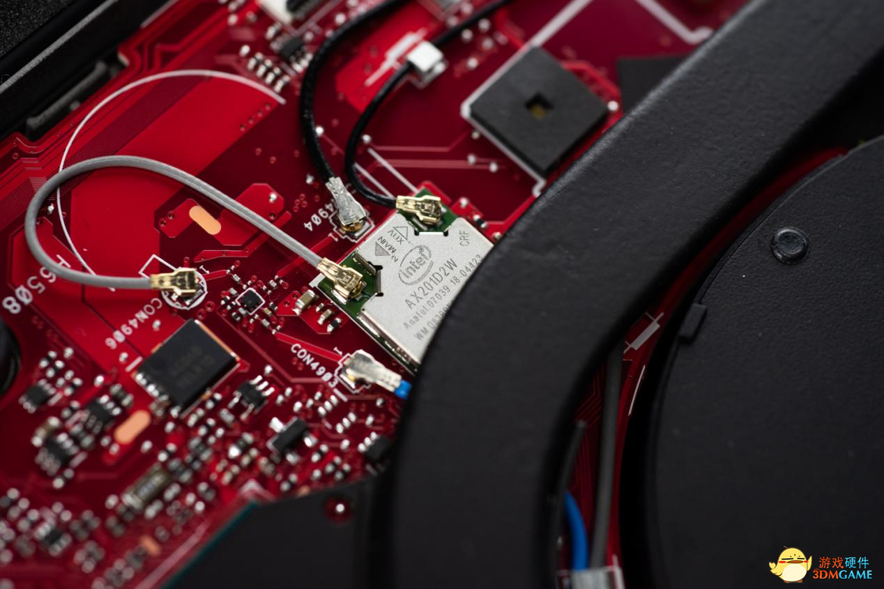 其他部分,冰刃4 Plus采用了板载16GB+16GB内存条的设置,支持超频到3200MHz;整机只有一个M.2接口,标配的是一块1TB容量的三星PM981a。仅有一个M.2接口稍显有些可惜,但是纵观整块主板的话,的确没有太多空间再留一个M.2接口了。无线网卡采用的是一块Intel的AX201,支持WiFi 6和蓝牙5.1,这些也都是高端游戏本今年应该标配的硬件了。