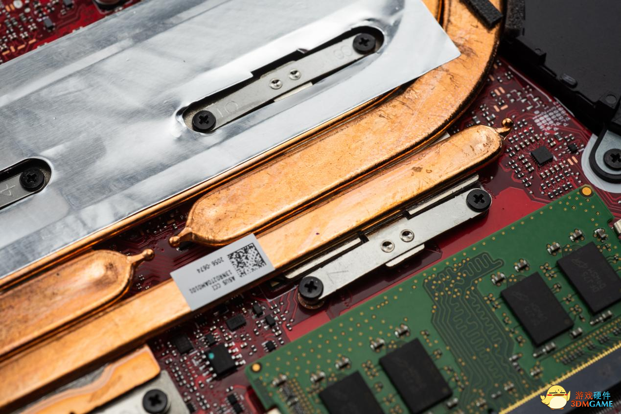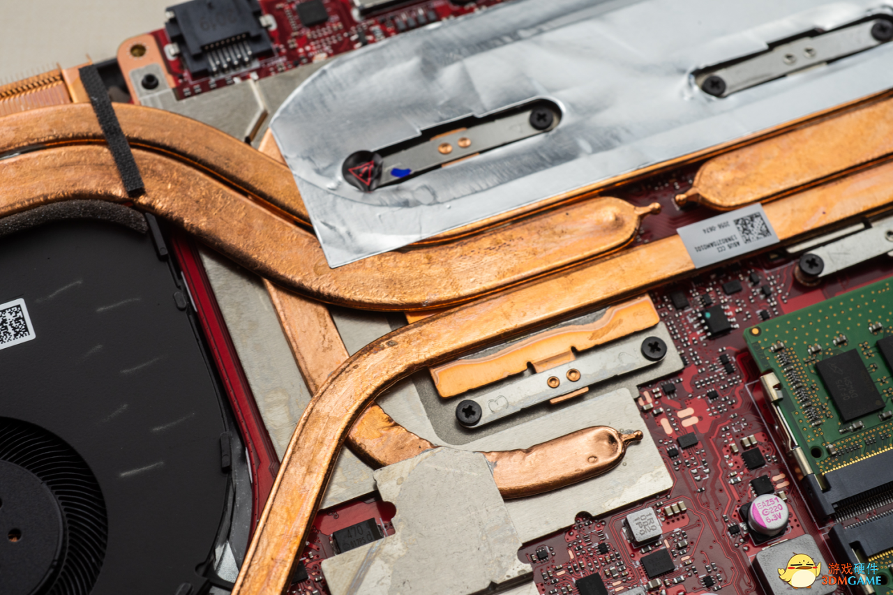 拆开底盖,首先我们看散热模组部分。魔霸新锐采用了5热管3风扇的散热模组,热管直径非常大。CPU部分分配到三根热管,GPU核心部分也分配到3根热管。其他小尺寸的热管配合上散热片很好的照顾到了供电原件、GPU显存部分;南桥部分也有一个单独的散热片用户保护和辅助散热。