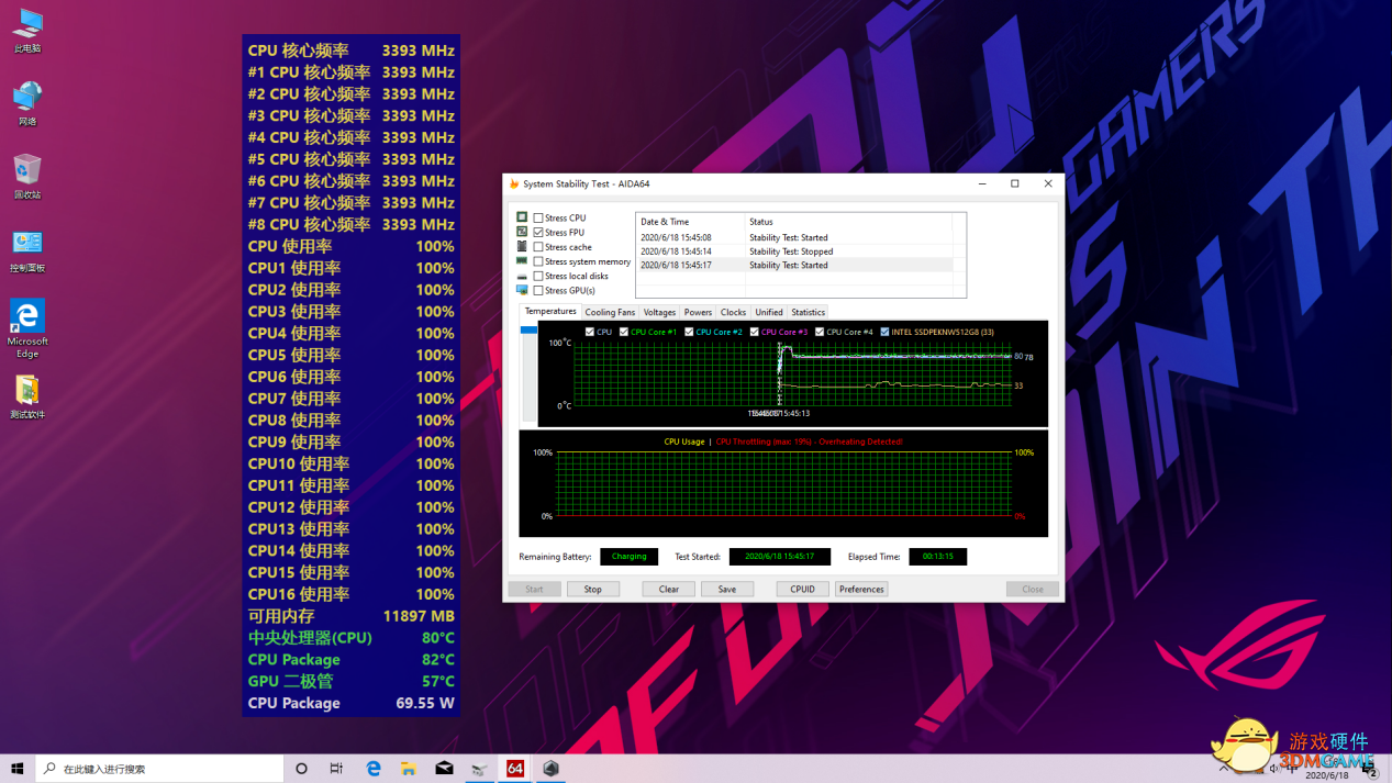 实际拷机测试,我们首先使用AIDA 64进行FPU的单拷测试,采用系统中提供的增强模式。在这个测试工况下,经过十几分钟的拷机,可以看到CPU稳稳的保持在3.4GHz,温度也锁定到了80℃不会继续升高,此时CPU的功耗为70W左右。