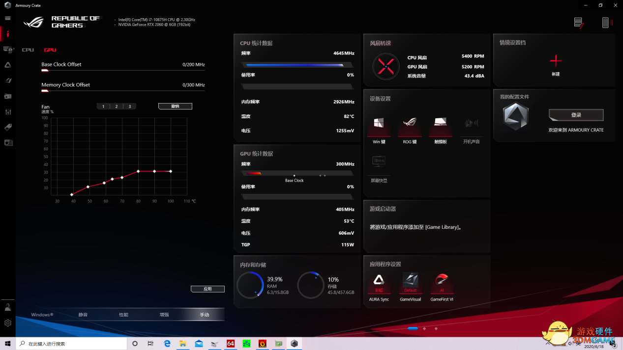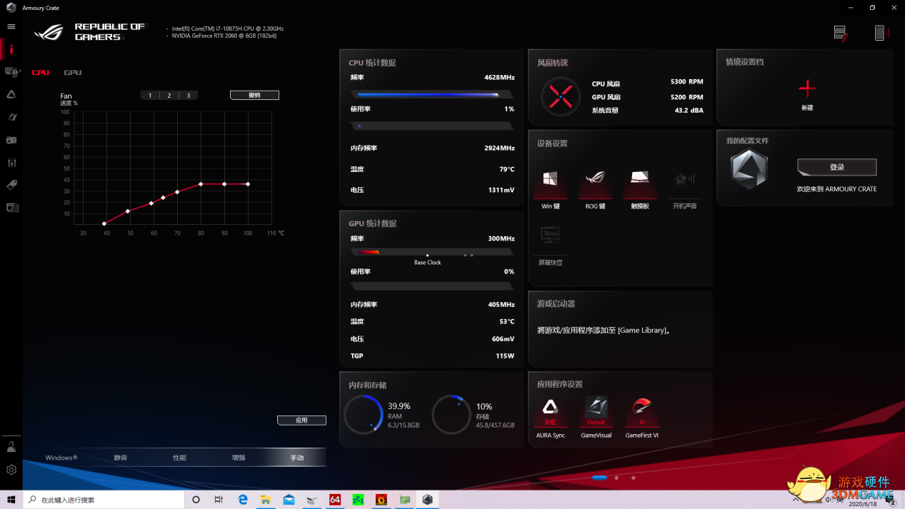 除了默认的增强模式以外,魔霸新锐内置的奥创智控中心当中还提供了一个手动模式。这个模式下允许玩家对CPU和GPU进行一定幅度的超频,并且还允许玩家分别调整CPU和GPU部分风扇的调度曲线,可以精细的调整不同温度下的风扇转速。这给了玩家更自由的调整空间。在这里我们手动把风扇曲线全部调整得更为激进一些,然后在进行一遍双烤测试。
