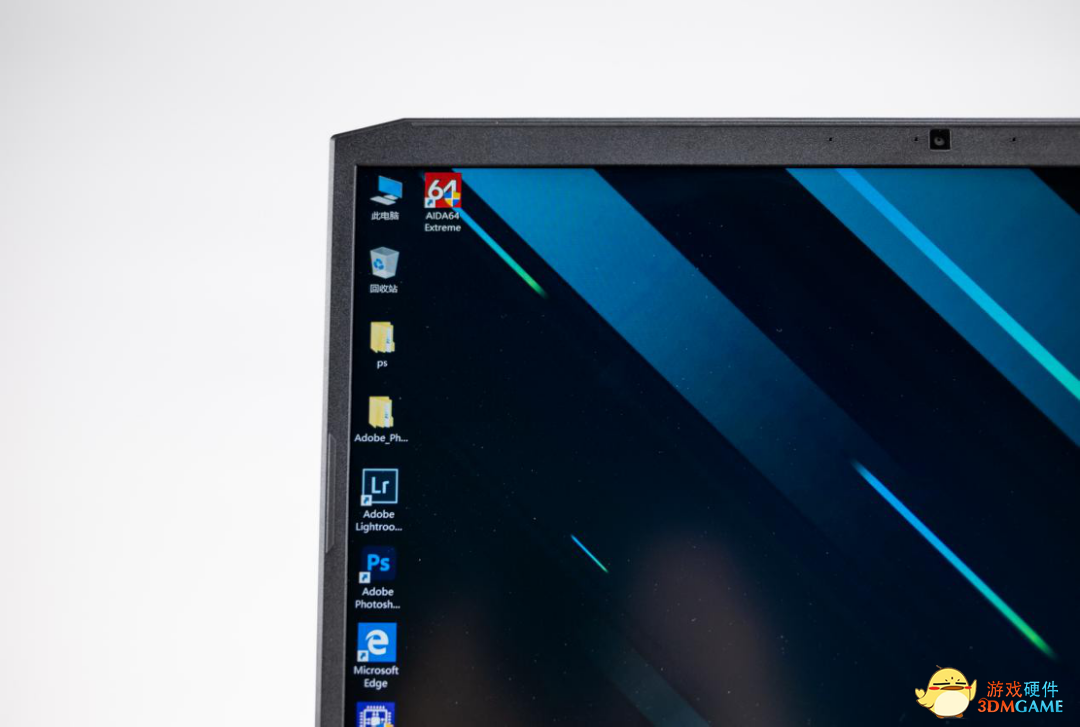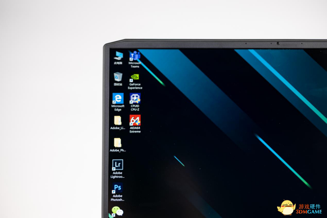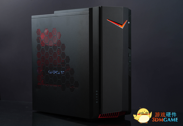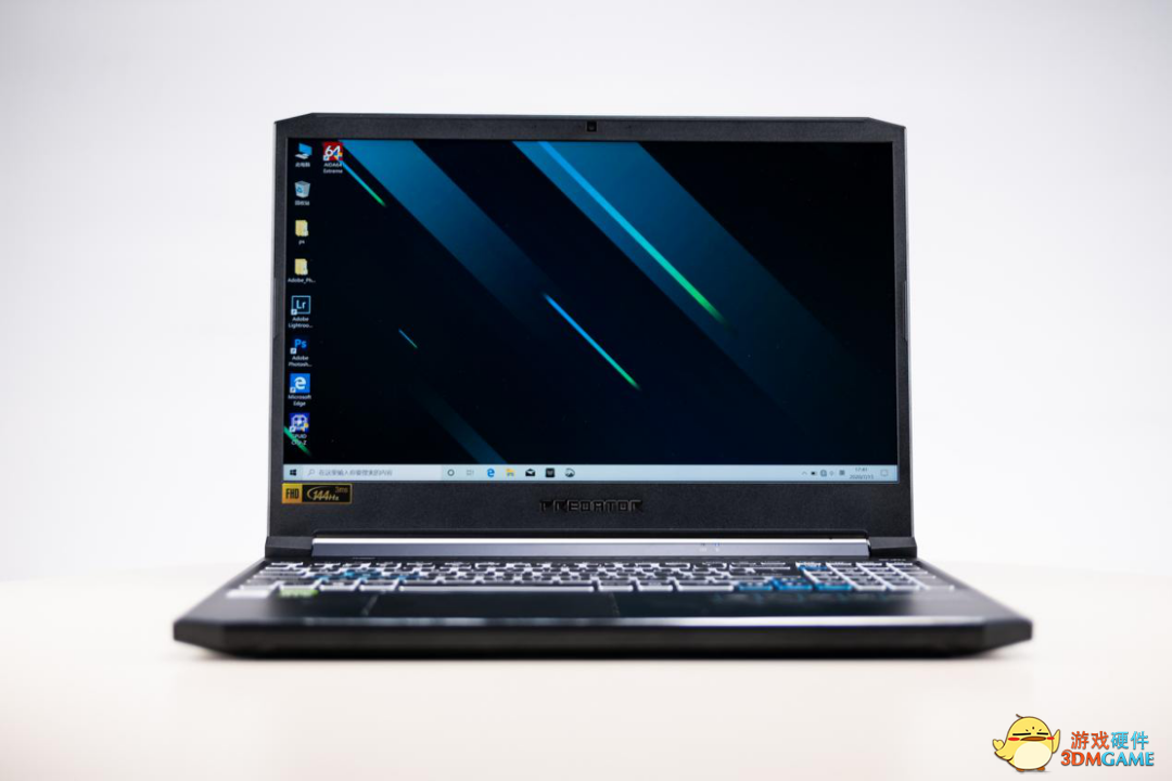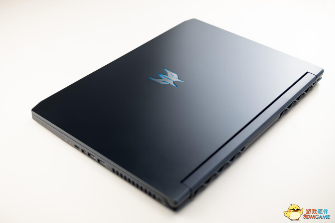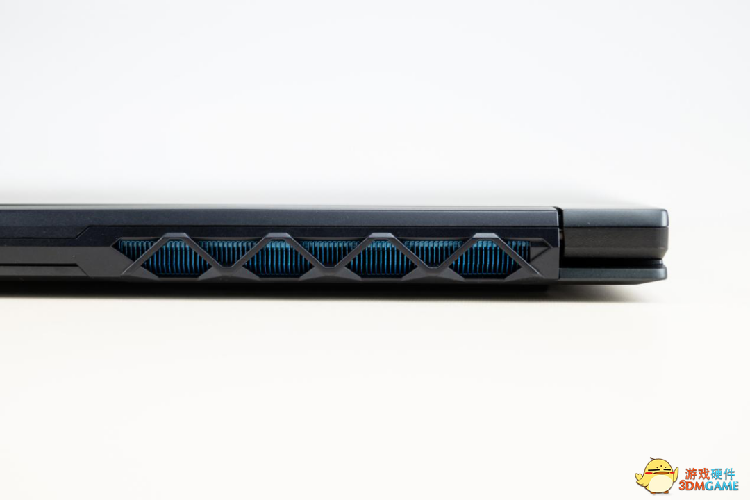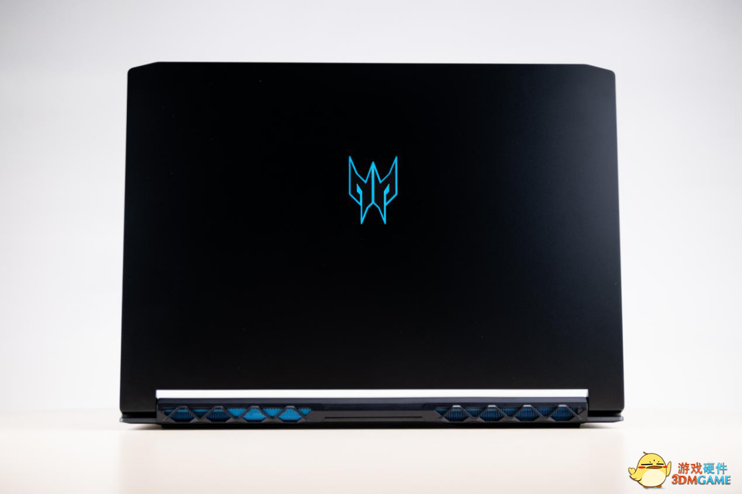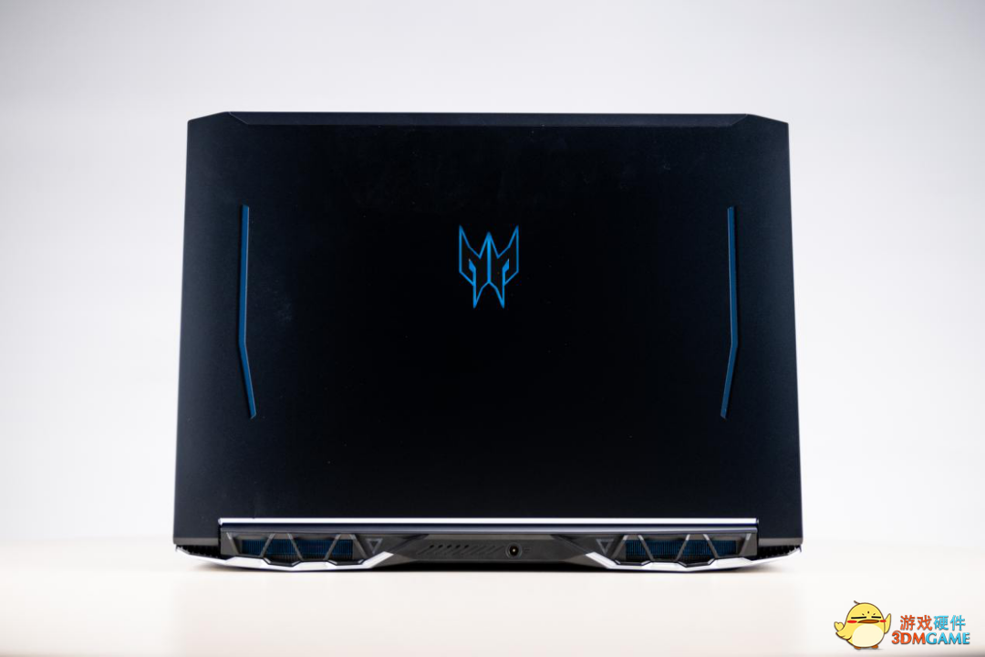 下面我们来看另一款定位在主流高端游戏本市场的掠夺者战斧300。这款笔记本的整体设计更加具有战斗气息。A面部分除了自家标志性的LOGO以外,在两侧也加入了两个装饰条。笔记本的出风口区域也做得更加立体,进一步强调了这种战斗气息。