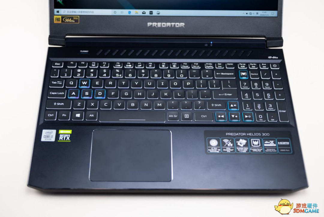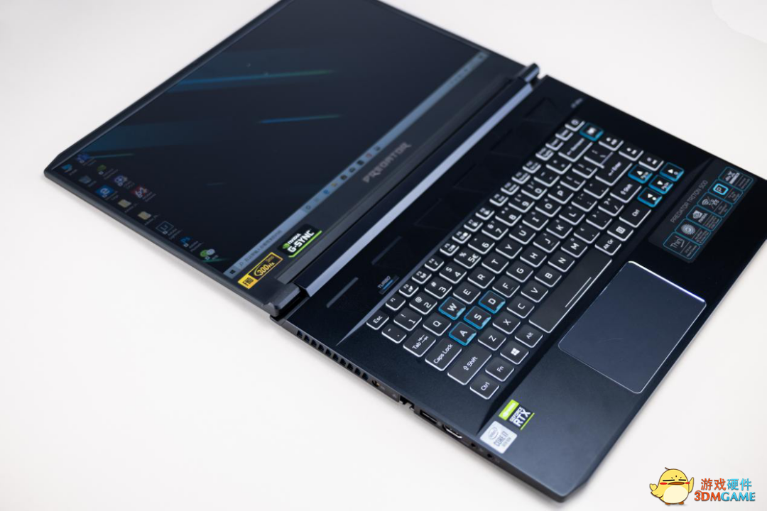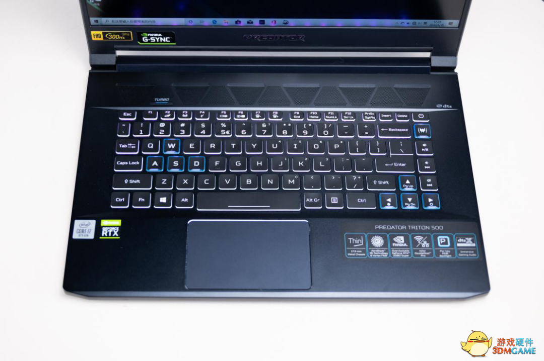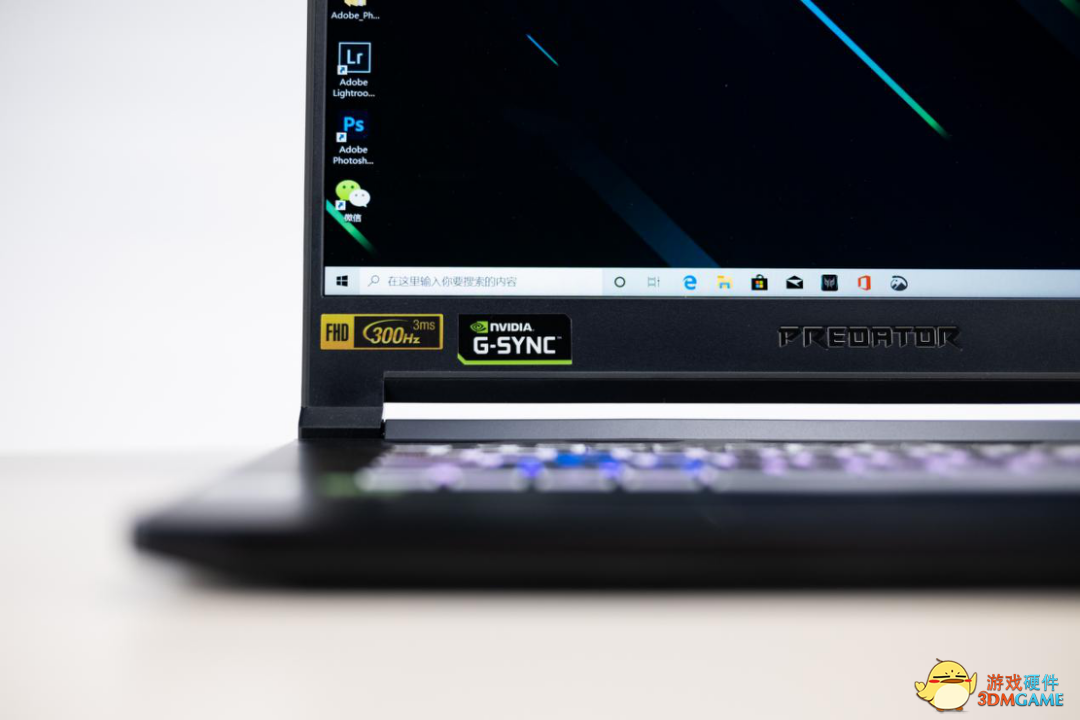 打开笔记本,屏幕部分是这款笔记本最大的一个卖点之一。掠夺者刀锋500采用了一块300Hz刷新率的IPS面板,并且还同时支持G-Sync功能,可以说是目前最顶级规格的屏幕了,没有之一。