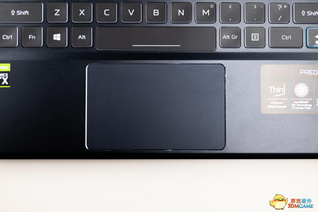 触摸板部分同样保持了还不错的面积,整体手感和前面的掠夺者刀锋500基本一致,在Windows阵营中都算是非常好用的触摸板。