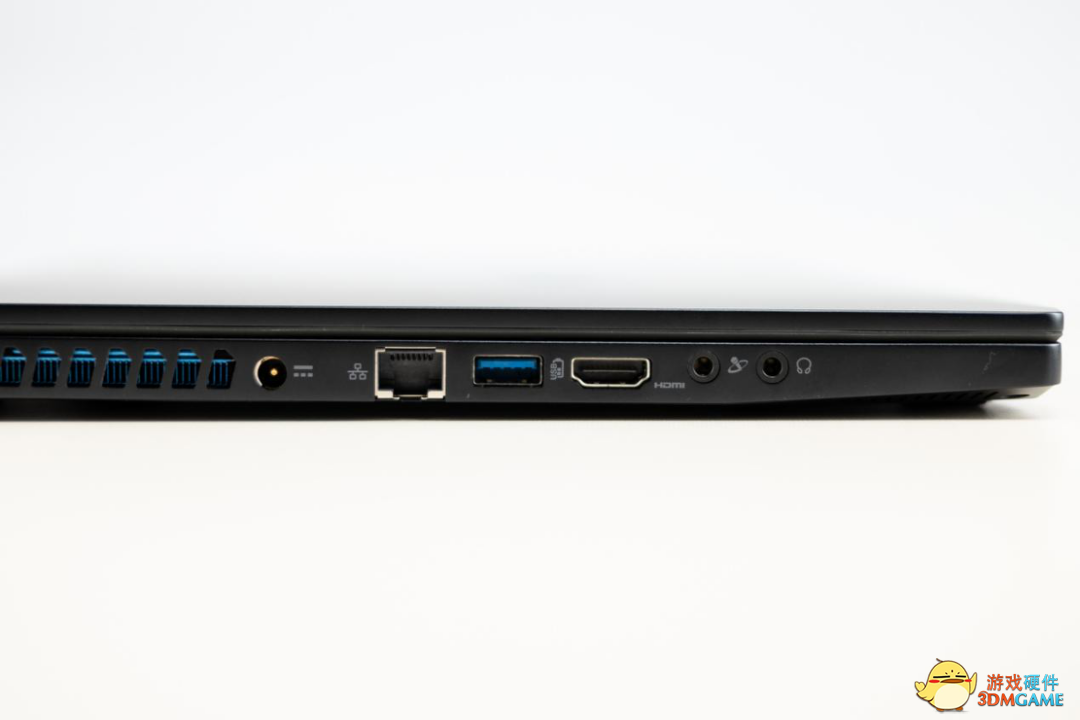 接口部分,左侧依次是电源、2.5G速率的RJ45接口(Killer E3100网卡)、USB 3.2 Gen2、全尺寸HDIM 2.0b以及3.5mm的音频麦克风和耳机接口。