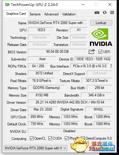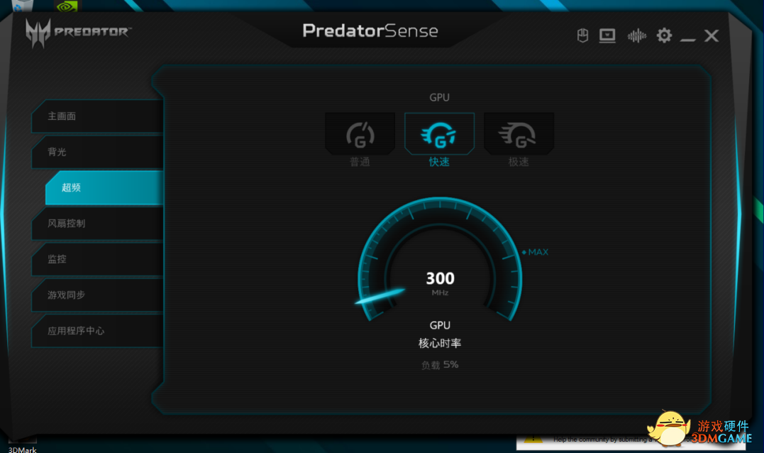显卡部分,掠夺者刀锋500搭载了目前移动端性能最为强悍的RTX 2080 SUPER Max-Q,在默认状态下基础频率735MHz,加速频率1080MHz,对应的是80W的综合工况功耗。而宏碁内置的PredatorSense软件中还给玩家们提供了单独为显卡超频的选项,在快速模式下,显卡频率提升到815MHz~1160MHz,而极速模式下则会更进一步提升显卡频率,来到855MHz~1200MHz,这个模式下的功耗可以达到90W甚至更高,能更进一步压榨出性能。我们下面进行的3DMark基准测试就是在极速模式下进行的。