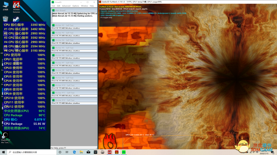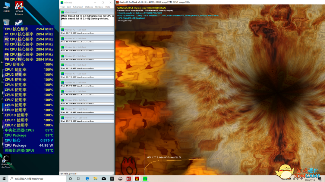 掠夺者战斧300这边,CPU温度稳定在89℃,各个核心的频率保持在2.6~2.9GHz左右浮动,功耗为标准的45W。GPU温度为77℃,频率为1035MHz。