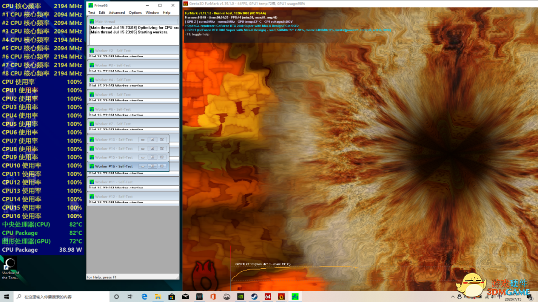 在系统默认状态下进行双烤测试,可以看到其中掠夺者刀锋500在几分钟后CPU温度稳定在了82℃,频率部分降低到了全核心2.2GHz左右,此时CPU功耗为39W。整体已经低于了CPU的默认频率。GPU部分稳定在72℃,频率在540MHz,也有比较大幅度的降低。