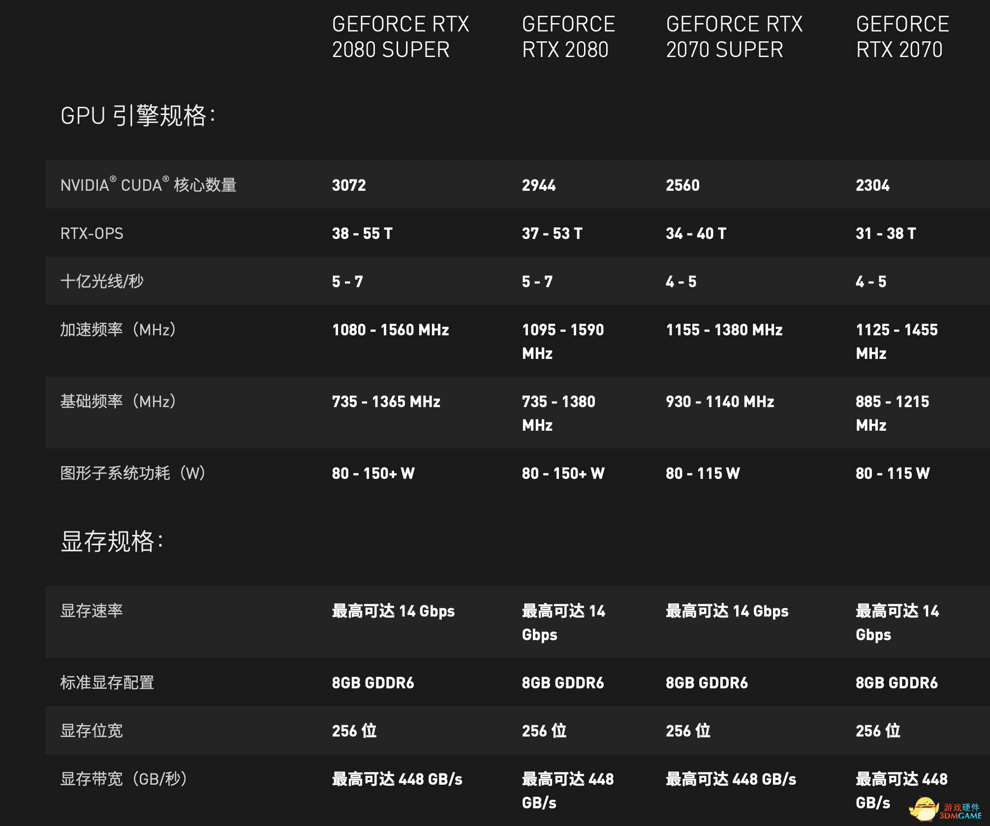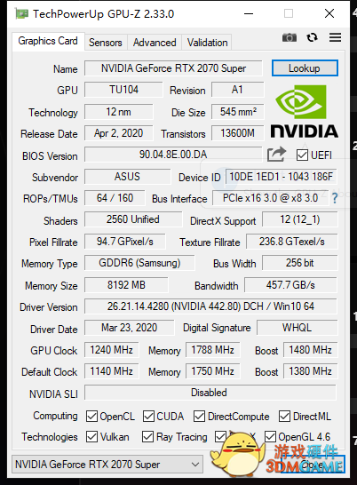 GPU部分,今天这款ROG 冰刃4 Plus搭载的是一块RTX 2070 SUPER显卡。和桌面端相同,在核心规格部分相比起RTX 2070有一定的提升,CUDA数量从2304提升到了2560,但是基础频率和最大加速频率稍有降低,移动端的TDP仍然保持了80W~115W的规格。