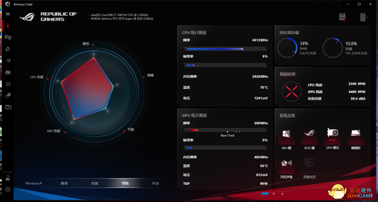 ROG 冰刃4 Plus身上这块RTX 2070 SUPER在默认状态下的基础频率1140MHz,加速频率1380MHz,对应的是移动端最高的115W规格。在奥创智控中心中开启增强模式后,基础频率提升到1240MHz,加速频率提升到1480MHz,性能会进一步增强,而且在一定情况下,ROG Boost功能还会让显卡的瞬时频率更进一步突破1480MHz的上限。