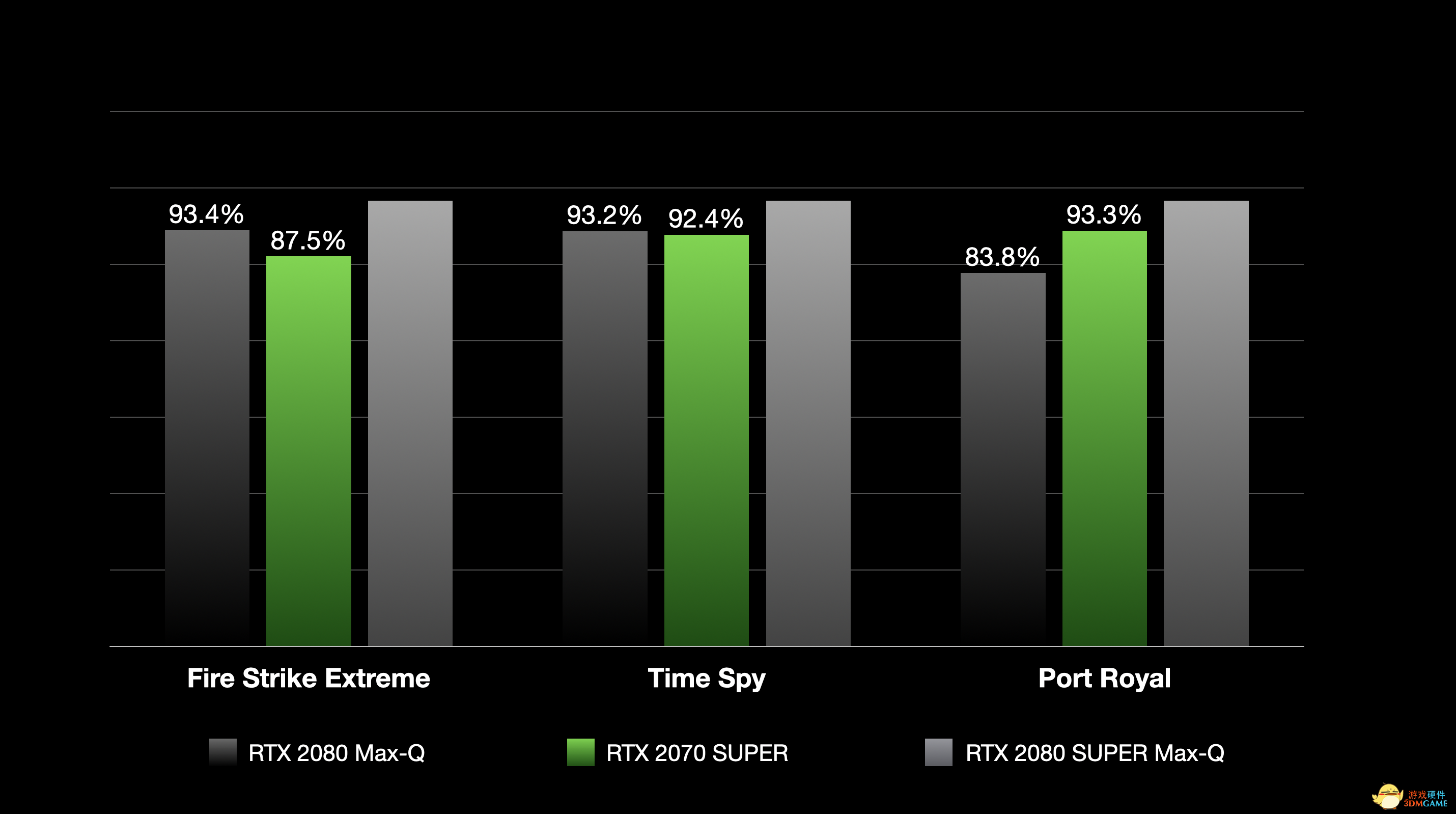 在3DMark部分我们看到这块RTX 2070 SUPER的成绩相较于80W~90W功耗运行的RTX 2080 SUPER Max-Q来说只稍微落后了一点,在以RTX 2080 SUPER Max-Q为基准的情况下,可以看到这块115W的RTX 2070 SUPER整体性能最多的项目中差距为13%,而在其他项目中的性能差距换算成百分比只有个位数。整卡的性能已经基本上和上代的RTX 2080 Max-Q非常接近了。