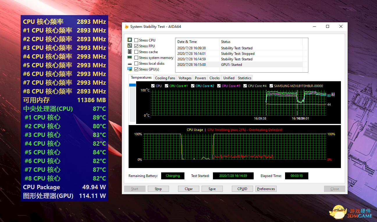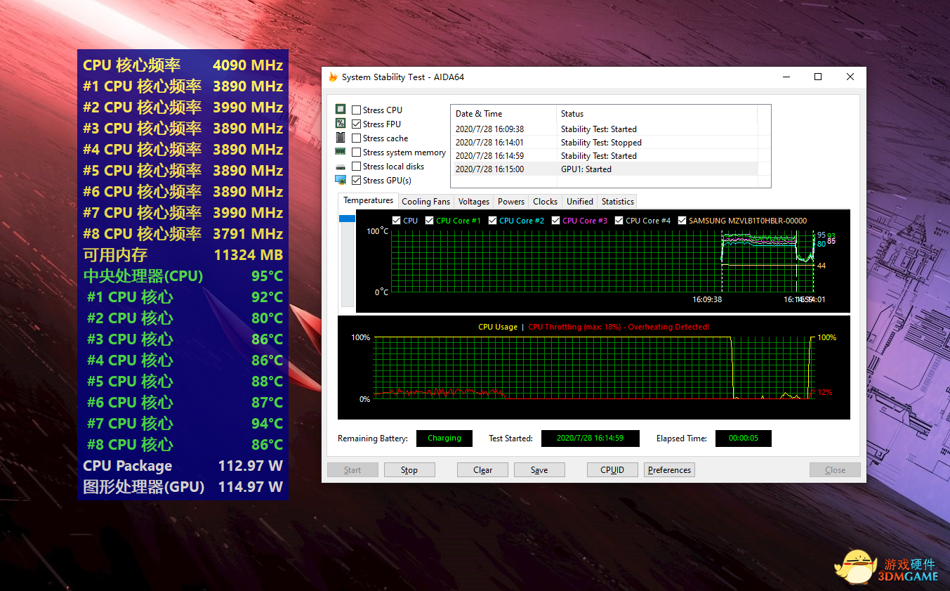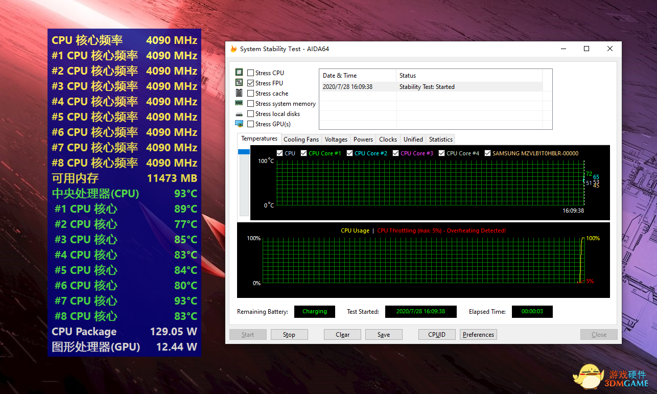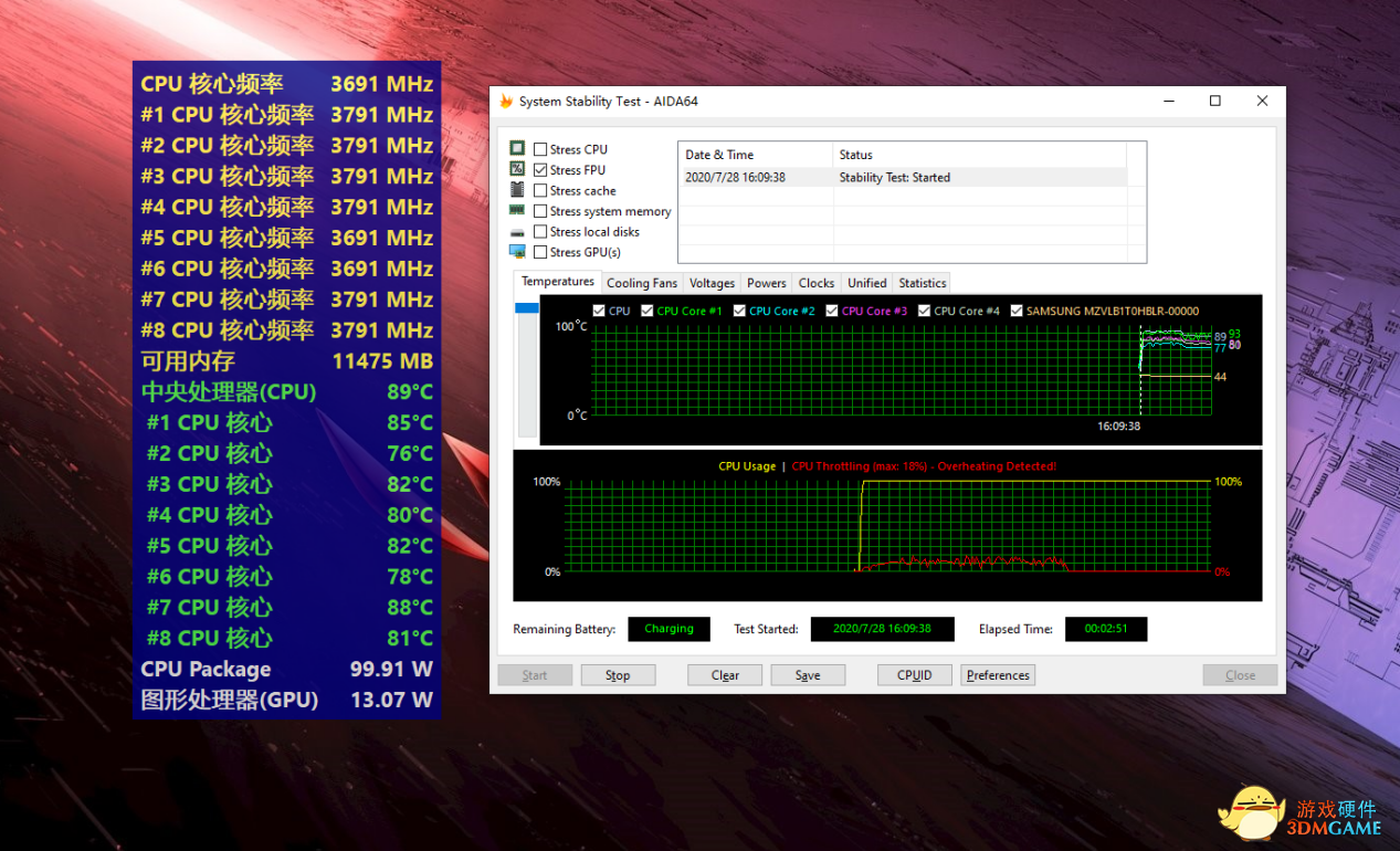 实际的烤机测试,我们使用AIDIA 64分别对CPU和GPU进行单双烤的测试。首先在单烤CPU的FPU测试项目中,可以看到在起初的2分钟内,CPU的功耗可以冲到130W水平,全核心都跑在4.1GHz左右;两分钟之后,CPU睿频结束,CPU仍然可以在100W功耗上稳定运行,全核心频率保持在3.8GHz左右,最终CPU稳定不超过90℃。