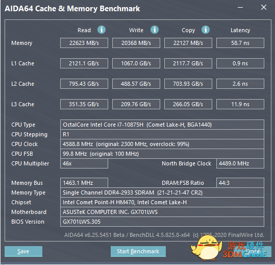 这台笔记本虽然配备了16GB内存,但是采用的是板载单通道16GB设计,所以在读写速度的成绩上比较低,但主板上还是有一个额外的标准内存插槽,用户可以很方便的后期扩展到双通道方案。