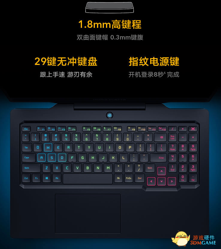 在游戏本的C面上,它的键盘按键手感相当不错。它有着较清晰的段落感,这使玩家在聊天打字以及游戏的过程中的感受更友好。并且电源键还采用了指纹电源键方便玩家的登入。另外小键盘的数字键键位相对比较紧凑,如果经常使用标准键盘的小键盘的话,盲打小键盘的失误率还是较高的。