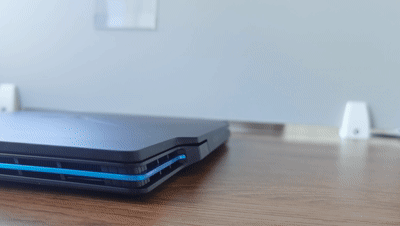 当然,对于游戏本而言,I7级别的CPU必须有着强大的散热功能才能发挥出它应有的水准。在以往的游戏本中,玩家需要垫高游戏本的底部,才能有效的减缓高性能CPU发出的热量,避免CPU过热而导致降频等情况发生。在这点上,荣耀猎人游戏本V700的升降式谷风散热既解决了高性能游戏本需要散热而导致的整机厚度加大以及需要额外购置散热垫来垫高游戏本的问题。在打开荣耀猎人游戏本V700后,机身底部会自动升起将留出一定的空间利于游戏本的散热,并且配备了一条蓝色的装饰条以及灯条来彰显它的时尚和个性。