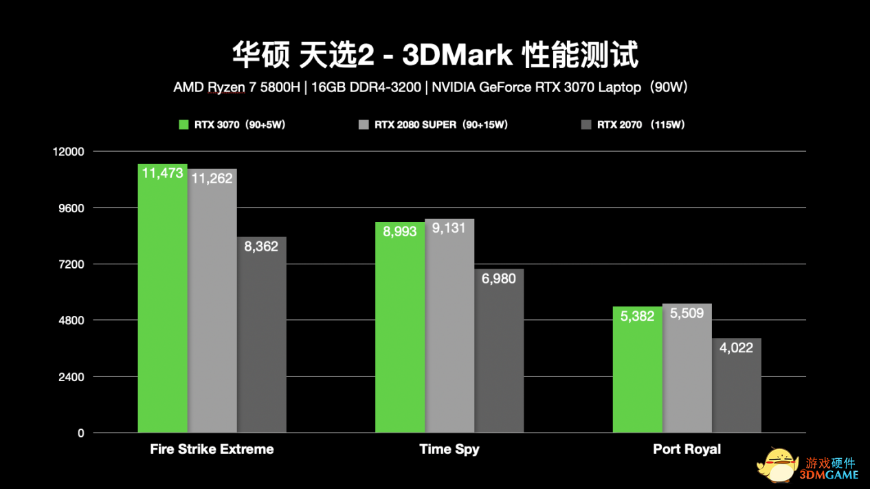 作为对比,我们引入了RTX 2080 SUPER (上一代Max-Q技术(90+15W))和RTX 2070(115W)的成绩给大家参考。从结果上可以看到,全新一代的RTX 3070在DX11部分的性能表现小幅优于RTX 2080 SUPER;DX12和光追踪测试部分的表现稍逊一筹,但也非常接近;整体成绩都要比功耗标定更高的上代RTX 2070高非常多,三个项目的提升幅度在37%、29%和34%,这个提升幅度可以说非常有诚意。