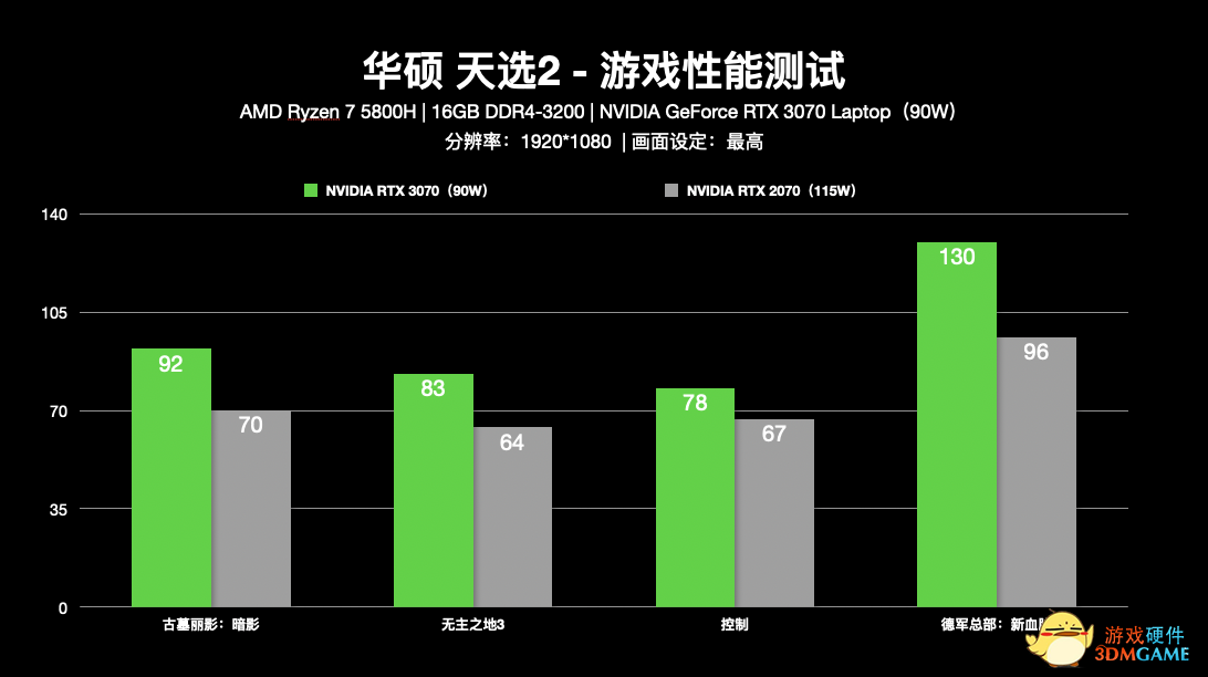 在性能表现上,我们也引入了上代同级别的RTX 2070笔记本在游戏方面的性能表现。可以看到成绩上的表现和前面3DMark跑分成绩的结果比较接近,搭载RTX 3070的华硕天选2在游戏表现上有了一个很大的提升,能够提供更高的游戏帧数。作为新一代中高端笔记本上都将搭载的GPU,我们对RTX 3070笔记本电脑GPU的升级幅度以及整体表现都非常满意。