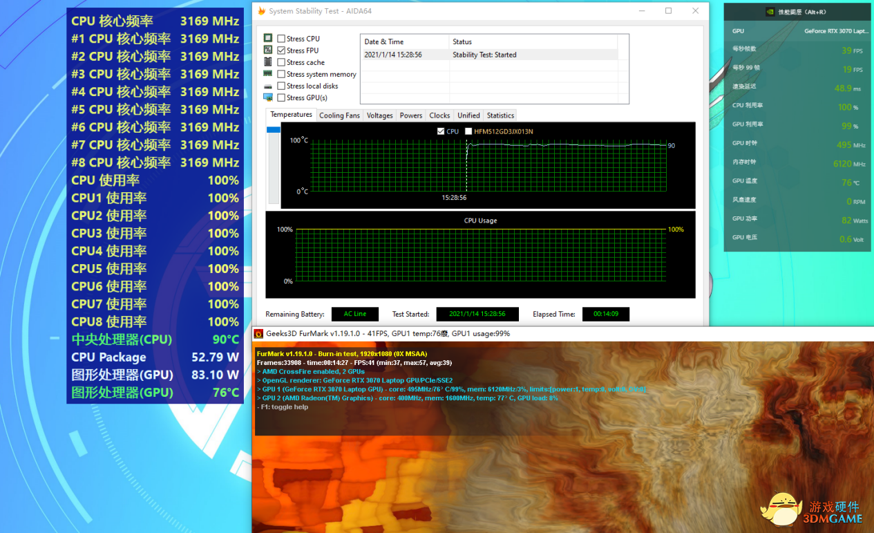 和性能释放能力直接相关的散热模组部分也得到了全面升级,热管数量和覆盖面积相较于上代来说有比较明显的提升,同时风扇也进行了升级。双烤测试中CPU可以稳定在52W以上的功耗运行,全核心频率3.1GHz以上,温度为90℃;GPU部分可以保持在1100MHz频率以上运行,同时温度仅有76℃。事实上在游戏中,GPU的频率可以保持在1660MHz以上,功耗在95W,要比双烤测试的成绩更好。
