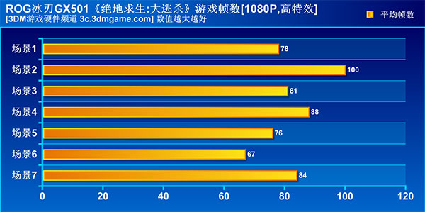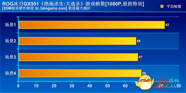 在这个设置下,我玩了三盘吃鸡,用Fraps记录帧数,发现在极致画质下,ROG冰刃GX501吃鸡的平均帧数在66~69帧。