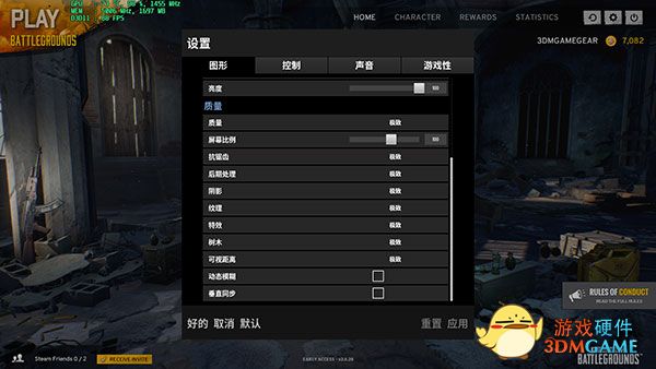 打开吃鸡,首先我开了极致特效,分辨率设置为1080p,屏幕比例100%。