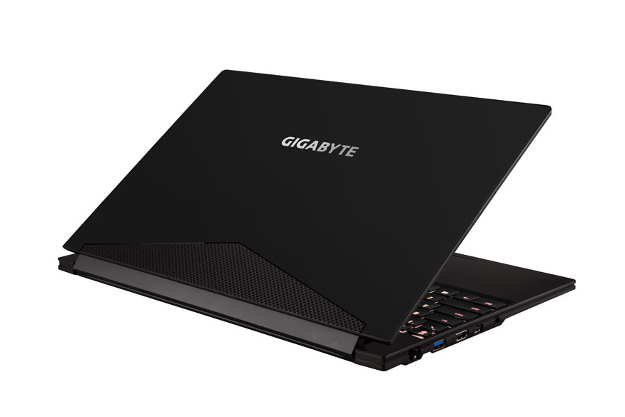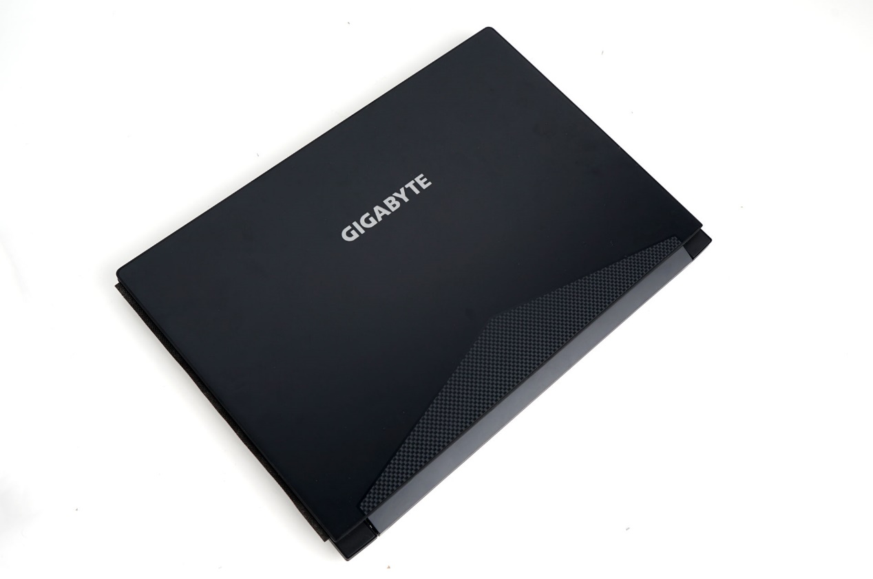 取出笔记本后,最先映入眼帘的就是A面上的GIGABYTE大LOGO,这个LOGO在笔记本开机后还会发出柔和的白光,而在转轴上方技嘉游戏本中非常常见的三角形图案,这块区域采用了碳纤维材质设计,手感十分出色,不过单看A面,我们还不足以看出这款MAX-Q笔记本究竟和其他笔记本有何不同,接下来我们详细的看一看这款笔记本的细节和结构设计。