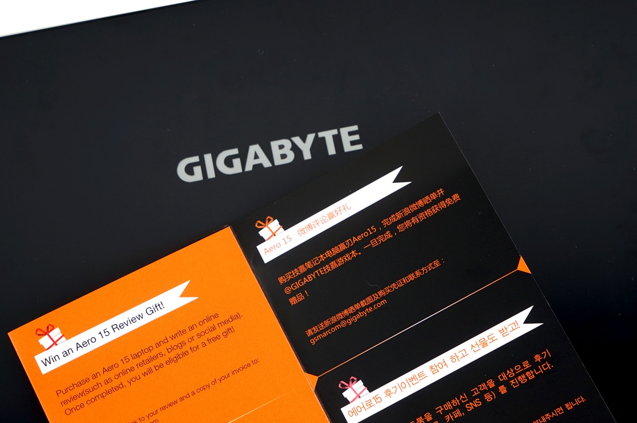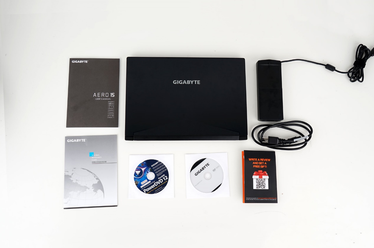 取出所有配件后,可以看到除笔记本、充电器外,技嘉Aero 15X配件还有两本说明书以及快速上手指南,两张驱动光盘以及一张欢迎卡。