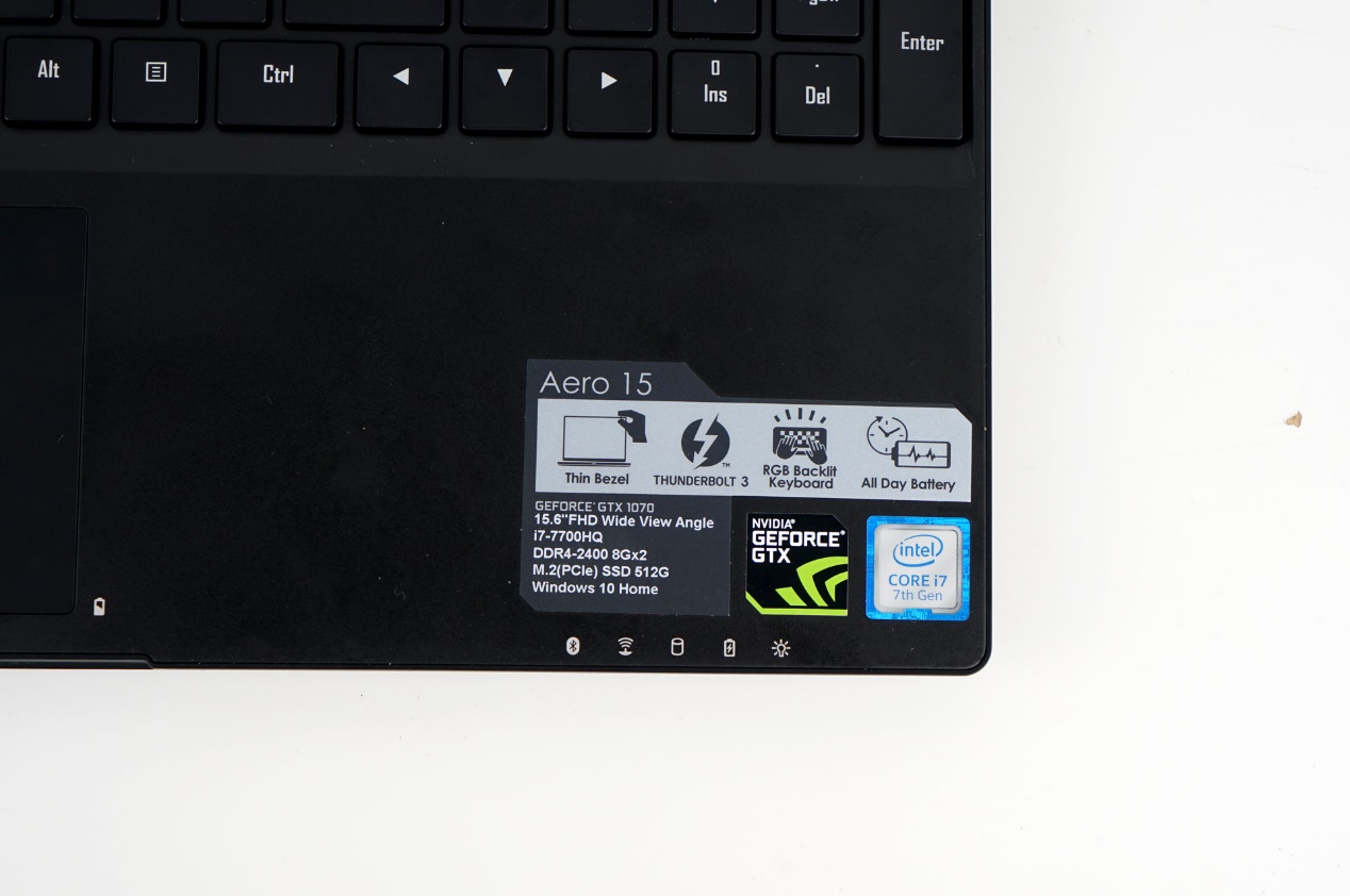 技嘉Aero 15X大部分的规格都在C面右下角有所体现,CPU搭载了中高端笔记本上很常见的Intel Core i7-7700HQ,而显卡为MAX-Q设计的GTX 1070,内存为两条8G DDR4 2400 MH内存,更厉害的是技嘉Aero 15X还使用了性能拔群的三星 SM961 M.2 NVMe 512G SSD,另外我们前面提到过的窄边框、支持雷电3接口、RGB键盘灯以及可保证全天待机的高效电池也同样得以应用。