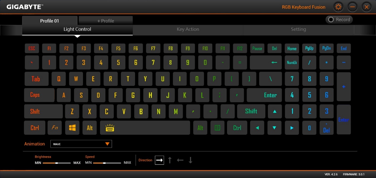看完笔记本外观后,我们来玩一下技嘉Aero 15X自带的技嘉Keyboard Fusion灯效软件。通过主界面可以看到软件总共分为三个功能区,不过对于灯效调节来说,我们最主要用到的还是图中的分区。