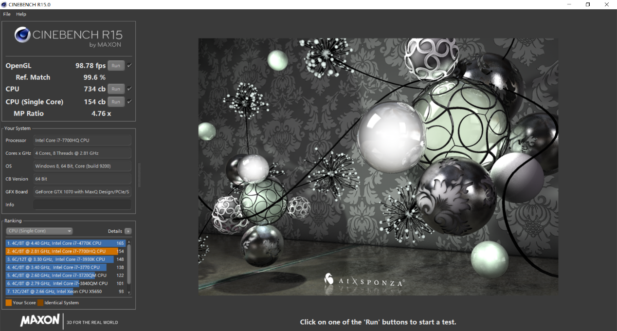 在CineBench R15测试中,从测试成绩中我们可以看到,i7-7700HQ的单核性能已经强于桌面版i7-3930K,也就是说在游戏更看重的单核性能中,i7-7700HQ有着足够大的发挥空间,而结合上方多核跑分成绩笔者有理由相信这块i7-7700足以轻松应对日常办公和游戏使用。